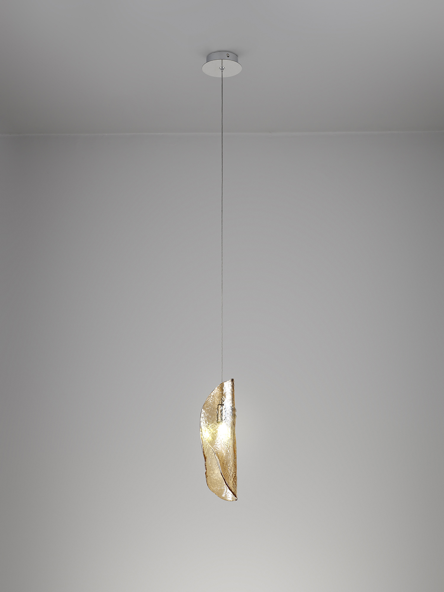 Scroll name is drawn from the wrapped glass pieces which diffuse the light emitted from the G9 lampholders, each suspended from an individual drop. With the picturesque Amber glass a serene ambience is provoked by the textured surface of the glass piece which shimmers beneath the coloured tint like light on water.