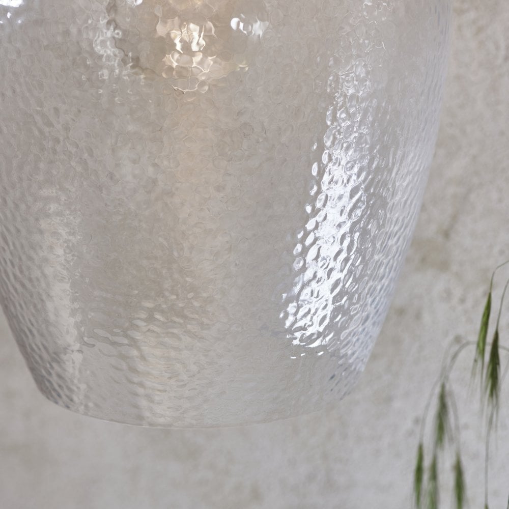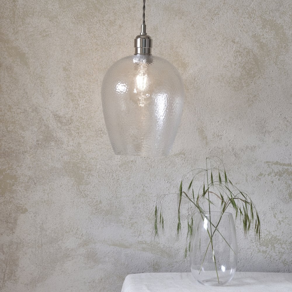 Polished nickel single pendant with grey fabric flex and finished of with hand blown hammered effect clear glass, ideal for kitchen islands or dining room tables, Other sizes and metal finish’s also available. See our full range of single pendants online today.