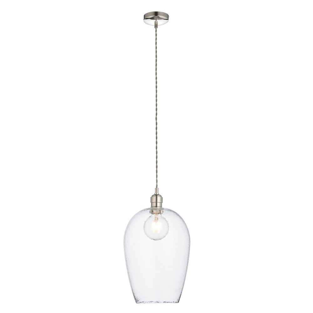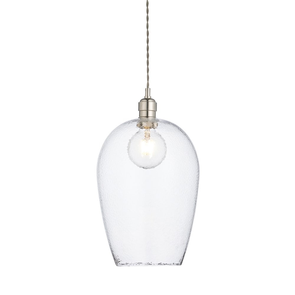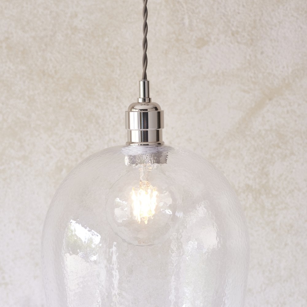 Polished nickel single pendant with grey fabric flex and finished of with hand blown hammered effect clear glass, ideal for kitchen islands or dining room tables, Other sizes and metal finish’s also available. See our full range of single pendants online today.