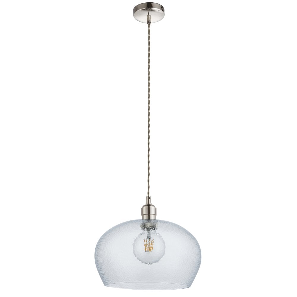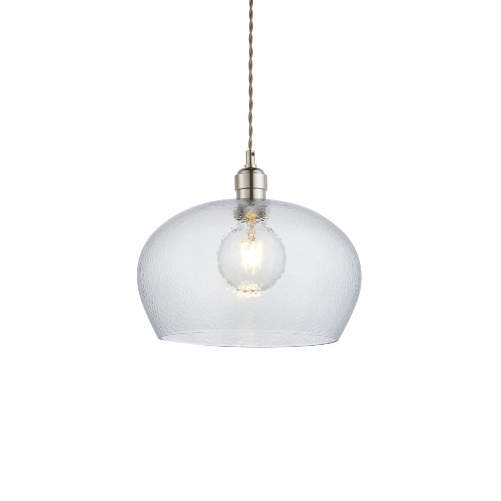 Polished nickel single pendant with grey fabric flex and finished of with hand blown hammered effect clear glass, ideal for kitchen islands or dining room tables, Other sizes and metal finish’s also available. See our full range of single pendants online today.
