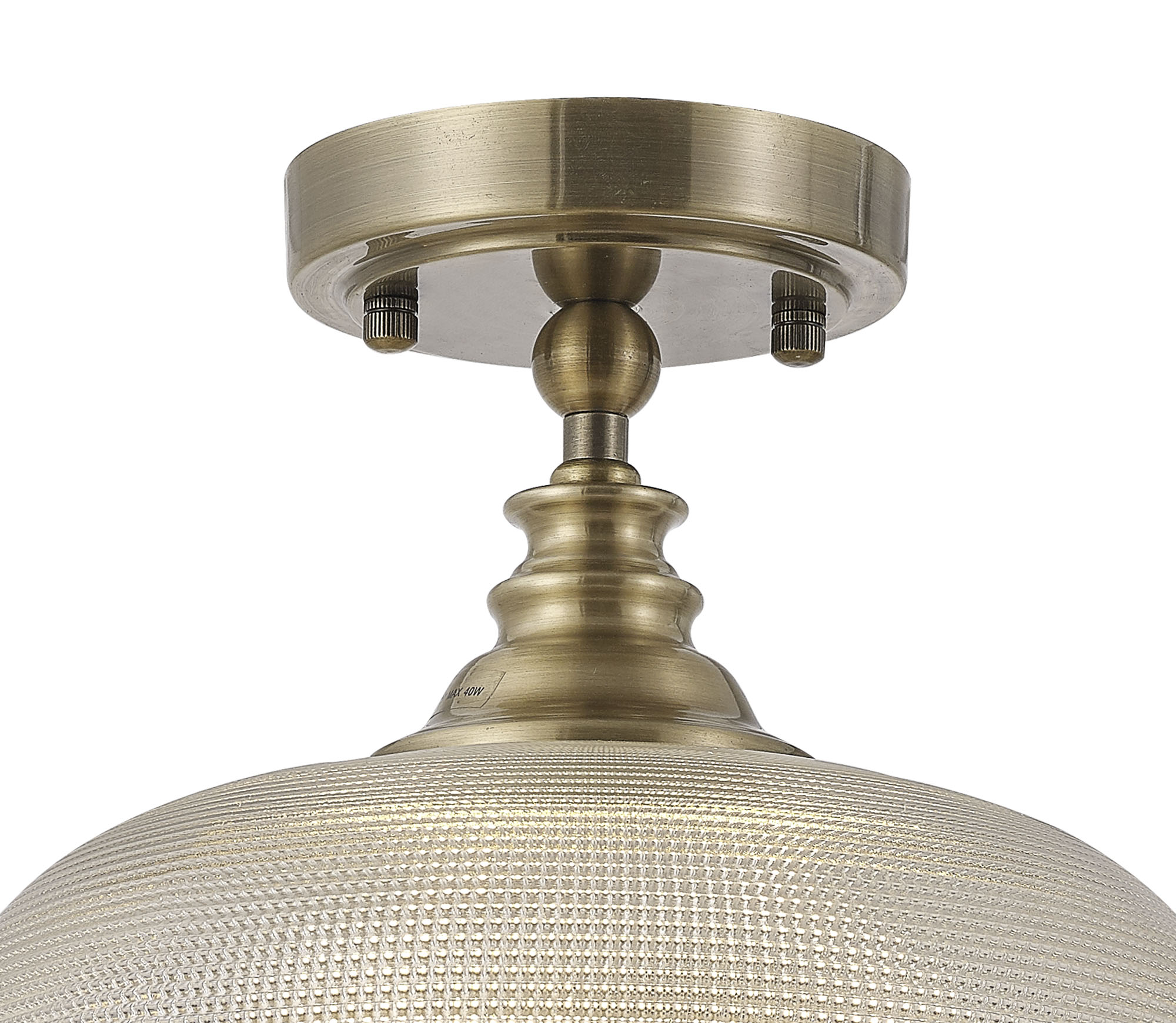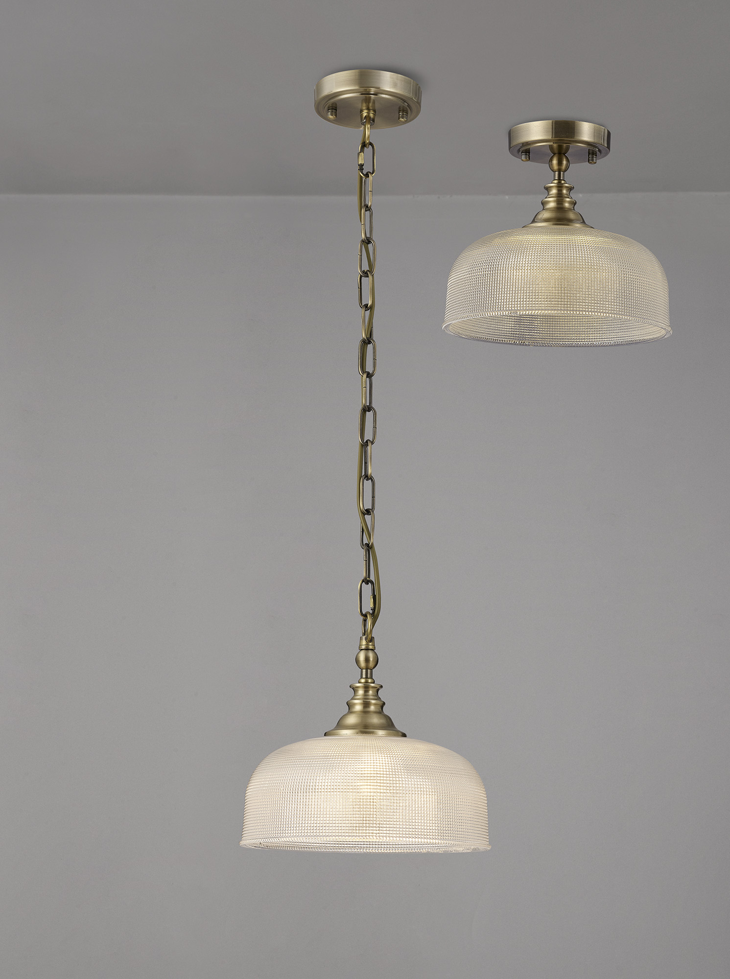 The textured prismatic glass featured on each lighting source not only gives an appealing visual when the lights are not in use but also a dazzling effect when illuminated by the wide number of lamps available for use in each fitting. This range is available in three colour finishes; antique brass and polished nickel with clear glass and satin nickel with frosted, giving the collection an adaptability to the consumer’s preference and décor.