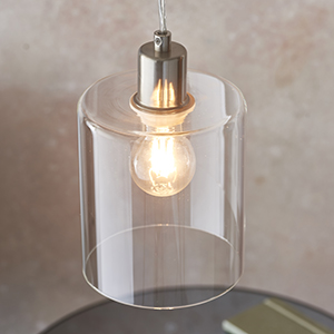 A modern pendant shade for contemporary interiors. Brushed nickel finish with clear glass shade.