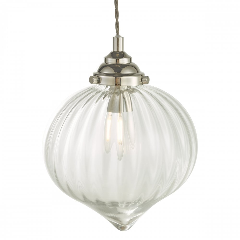 The DAYM100138 single pendant features a traditional drop shaped mouth blown glass with a more contemporary soft waterfall ribbing, gently diffusing the light. Complemented with polished nickel metal work and 1 metre of brown braided cable adjustable on installation.
