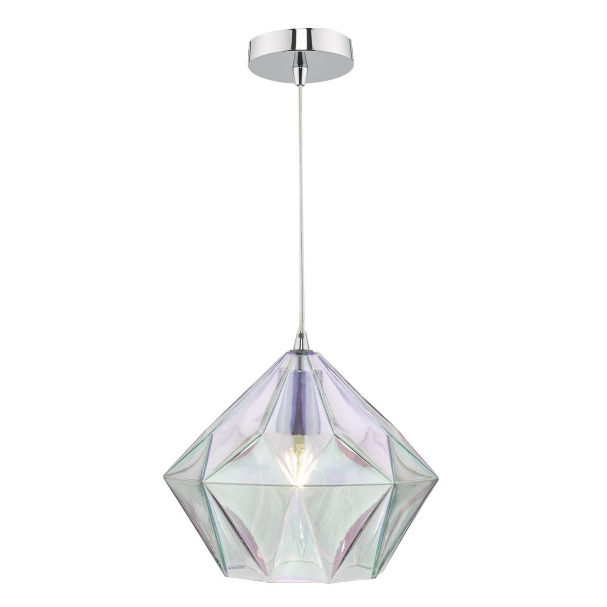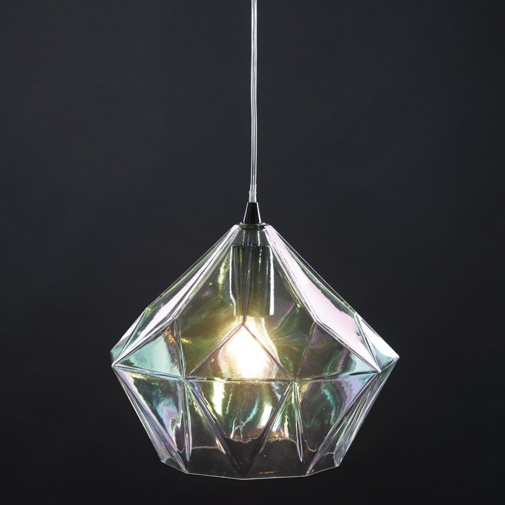 The enchanting Gaia ceiling pendant features a striking, iridised bevelled glass shade; complete with a polished chrome finished ceiling cup. The iridised glass shade of this alluring ceiling light can vary and the colours will change depending on the angle its viewed from.