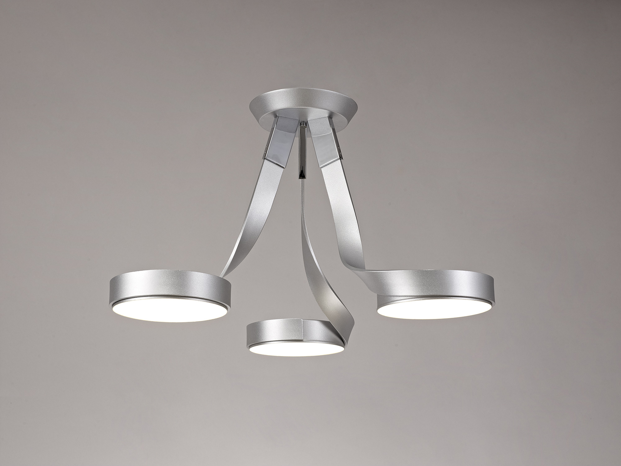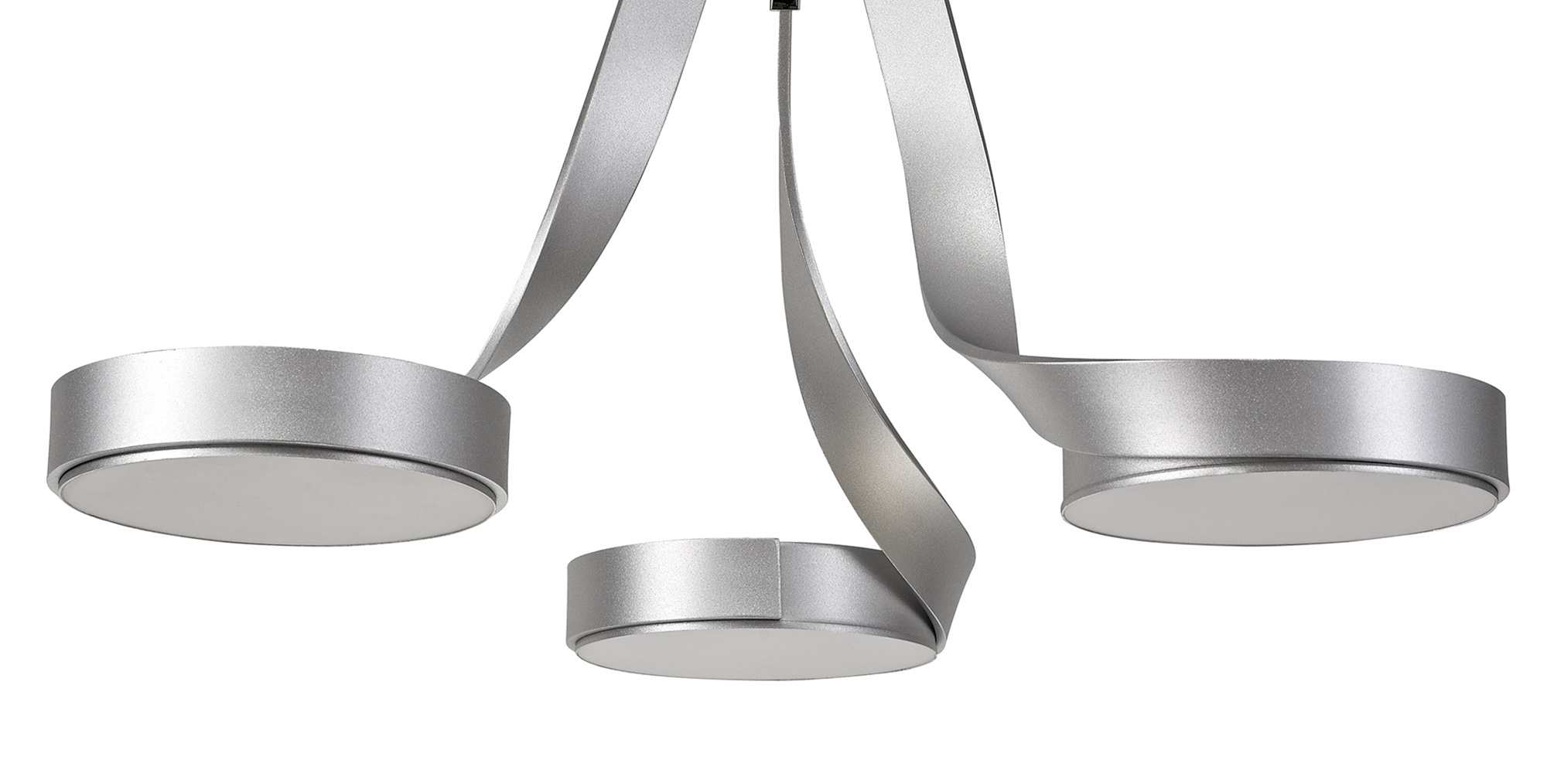 Silver framework manipulated to reflect lengths of ribbon which twist into a ring at the end. These rings encircle the round diffuser disk that houses the integral 3000K LEDs. The flat disk surface dispels the optimum amount of light possible to ensure there is no waste from the high wattage LEDs.