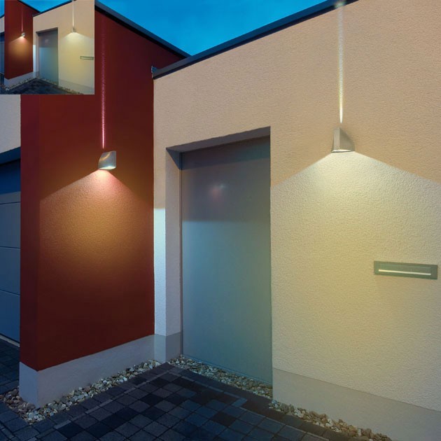 A modern LED outdoor UP & Down wall light, finished in stainless steel