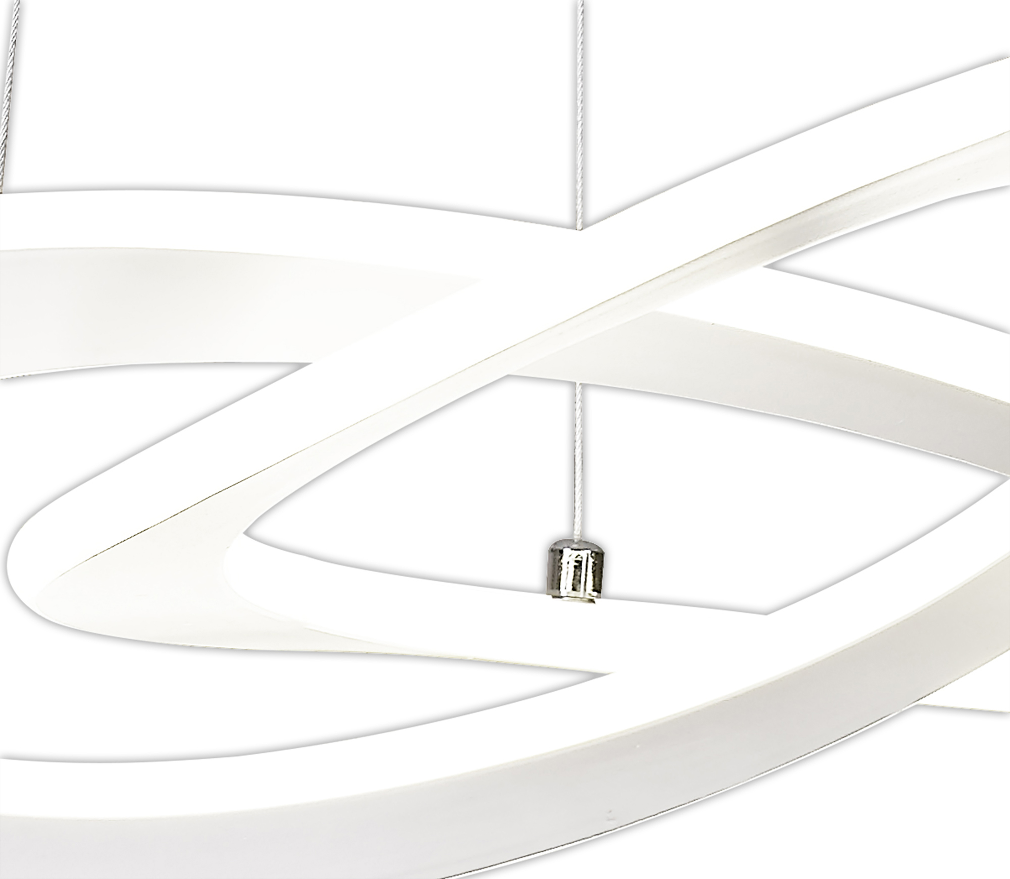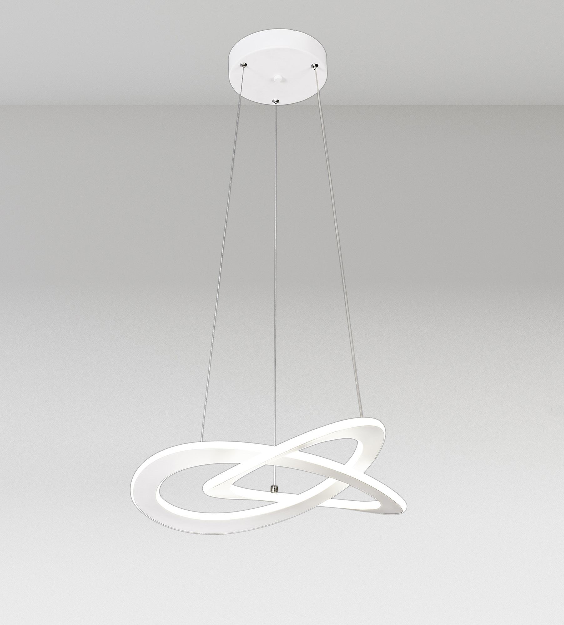 The Saturn range derives its name from the visual concept of its unique design. White metal rings are looped together imitating the distant view of planetary asteroid belts. Available as either a pendant light or ceiling light each fitting boasts an impressive wattage output providing ample illumination. The view beneath the lights forms a fluid triquetra shape ensuring an intriguing shape from every angled view of the lights.