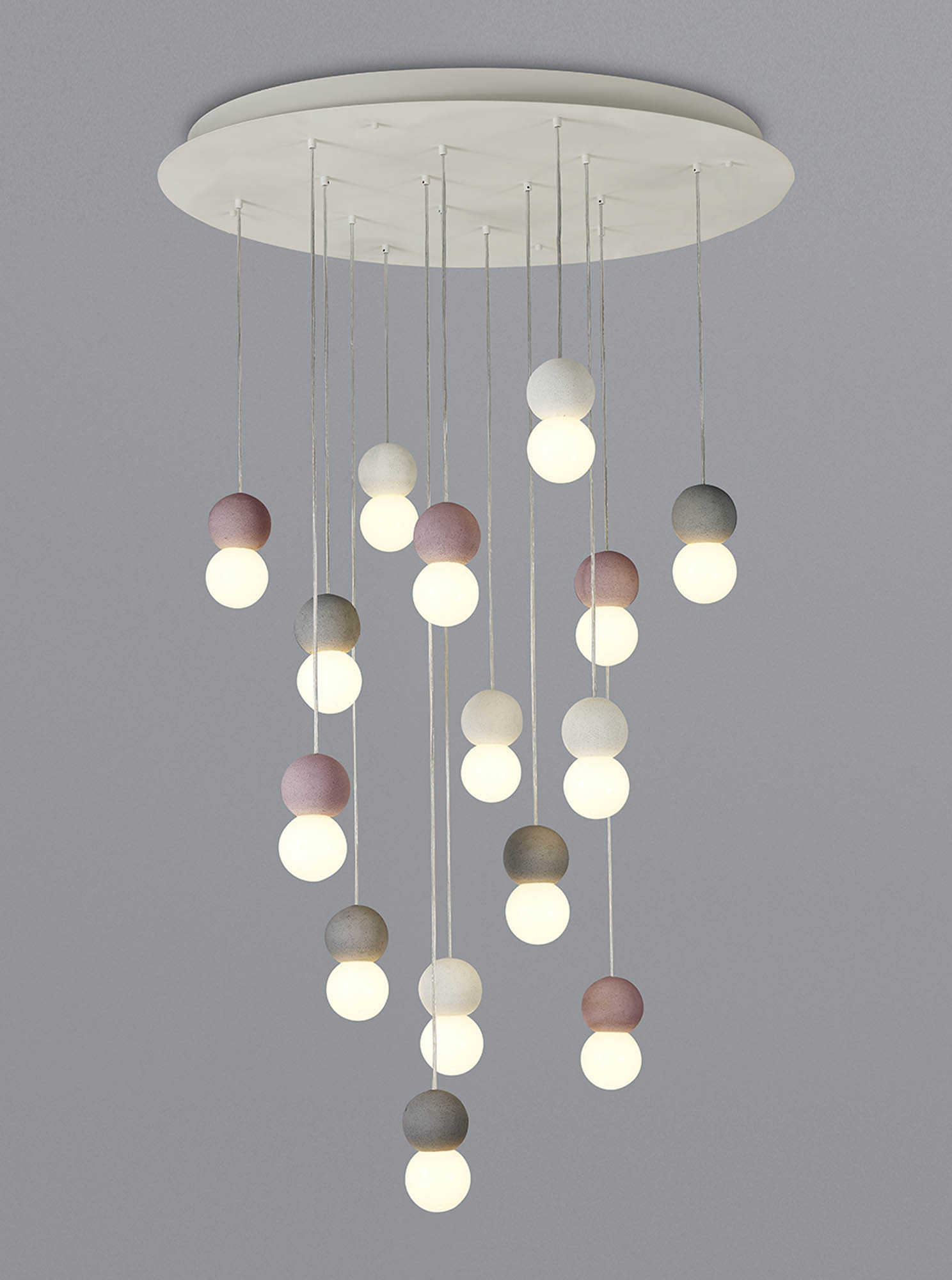 Galaxy is a collection that capitalises on the beauty of natural materials. Each concrete pendant conceals the E27 lampholder that can take the lamp of your choice creating a tailor made fixture.. This is harmoniously partnered with a combination of cement domes or cubes with soft red, grey and white colouring.
