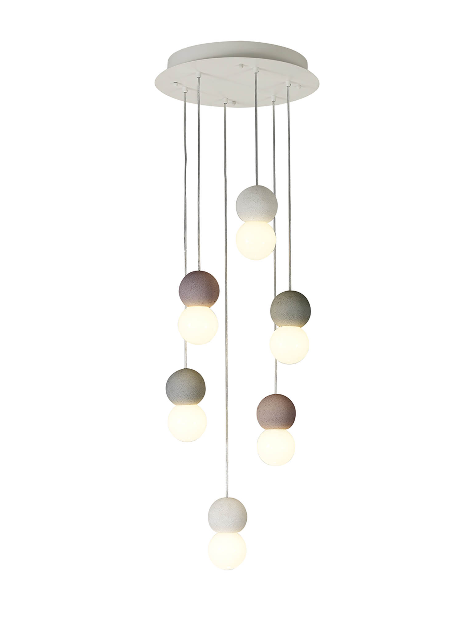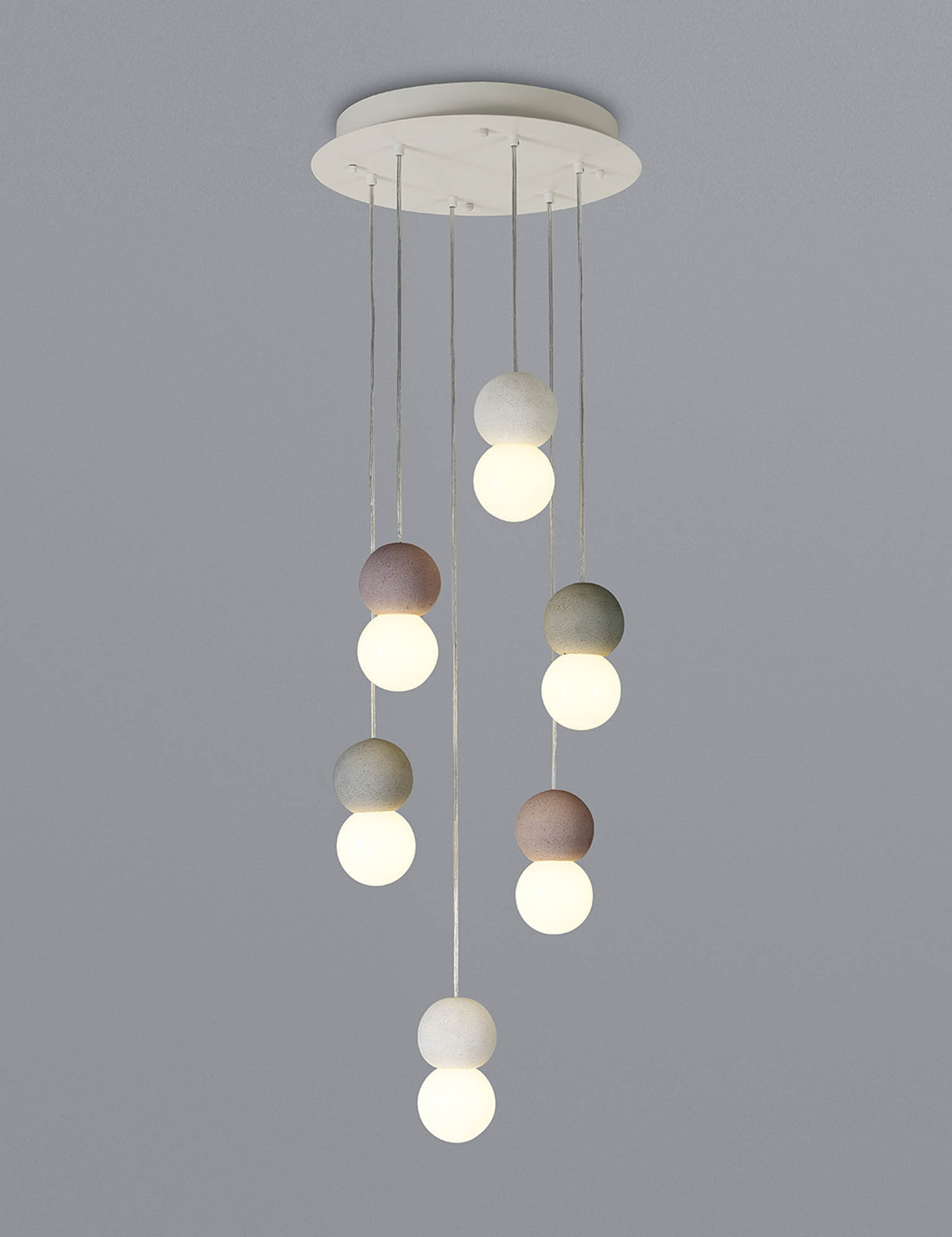 Galaxy is a collection that capitalises on the beauty of natural materials. Each concrete pendant conceals the E27 lampholder that can take the lamp of your choice creating a tailor made fixture.. This is harmoniously partnered with a combination of cement domes with soft red, grey and white colouring.