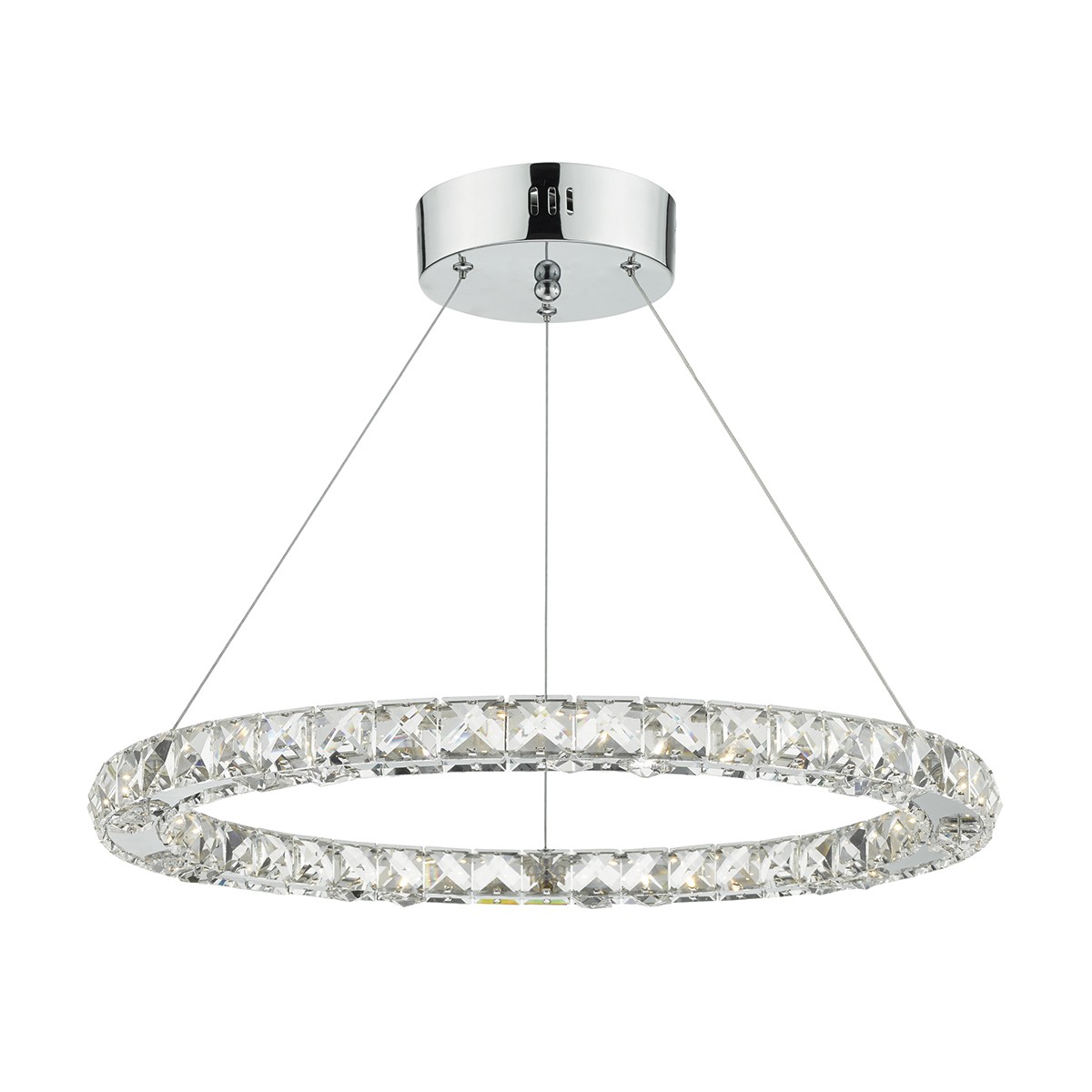 Fabulous hoop of faceted crystal squares set in a polished chrome frame. Illuminated by modern LED technology this light fitting truly sparkles from all angles. It provides a great centre piece. The Roma can be used with a suitable dimmer to create a beautiful relaxed atmosphere.