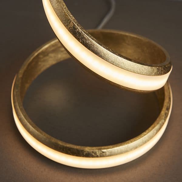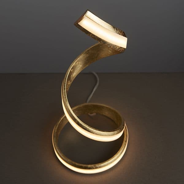 A unique contemporary table light with flowing illuminated curves, a perfect addition to today’s modern interiors. Luxurious gold leaf finish with white diffuser and integrated LED.