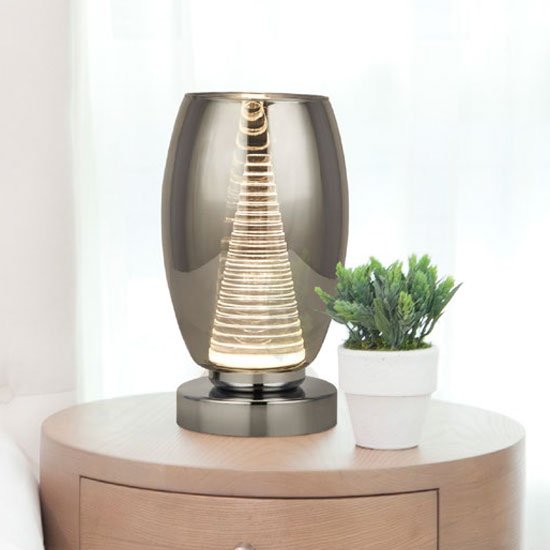 A modern LED Table Lamp polished chrome metalwork with smoked glass