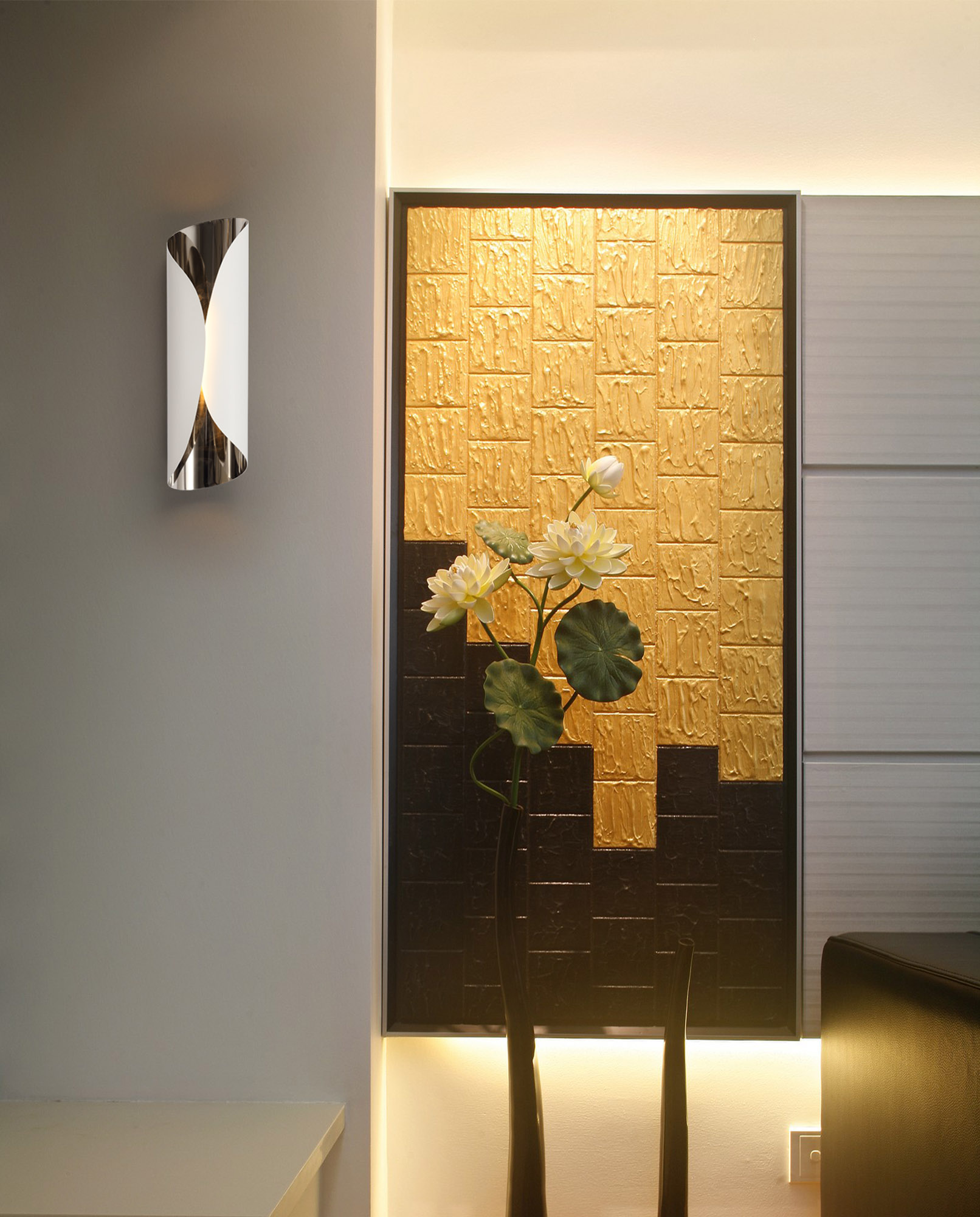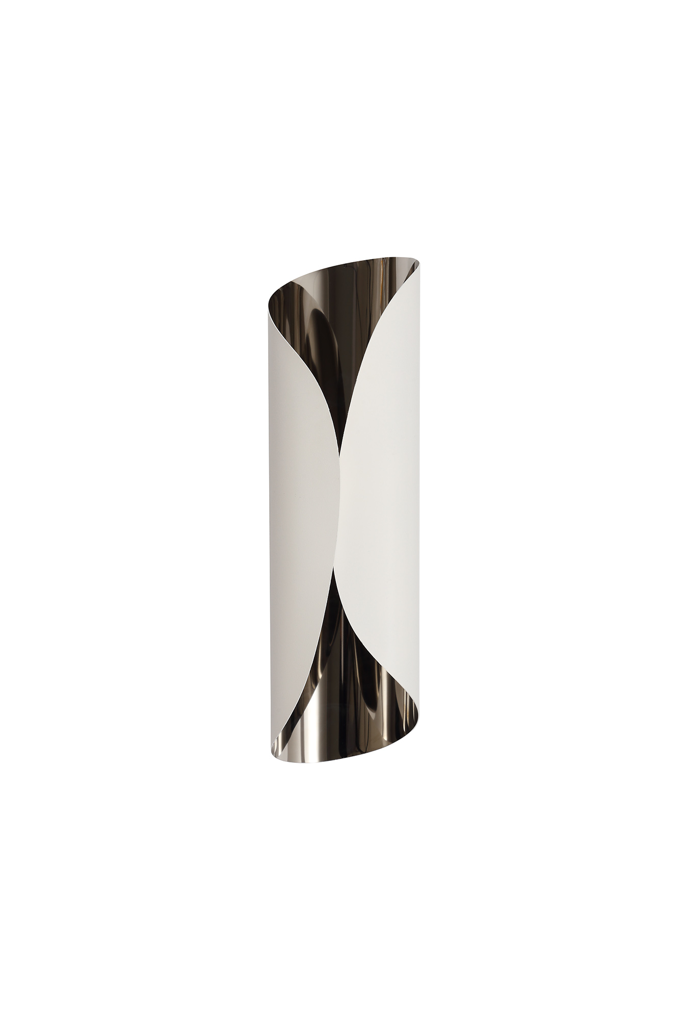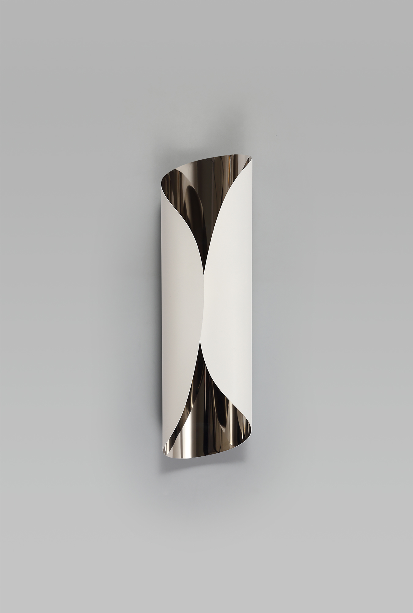 A modern LED Wall Light, Rolled into a curved over lapping shape. finished in white with chrome inside