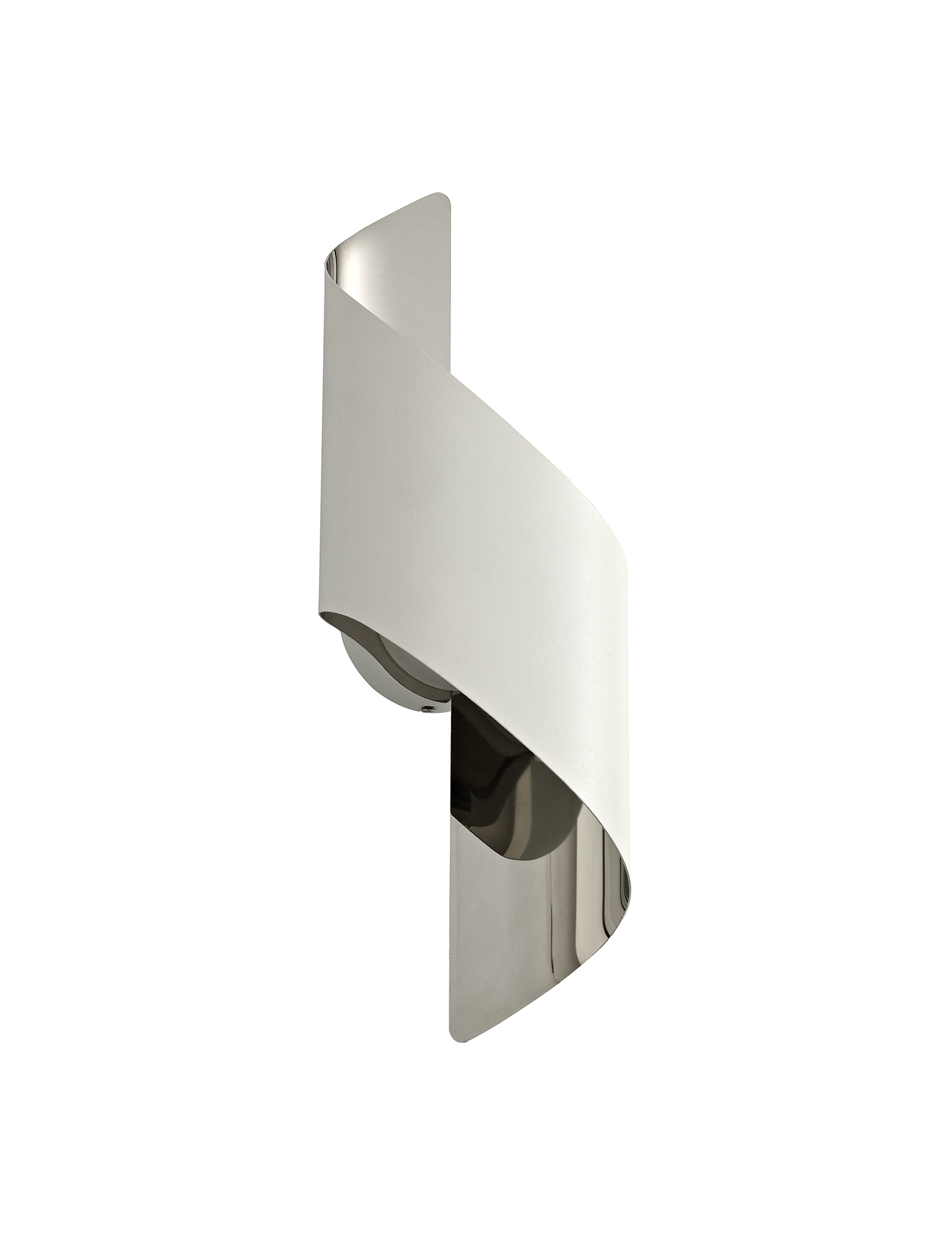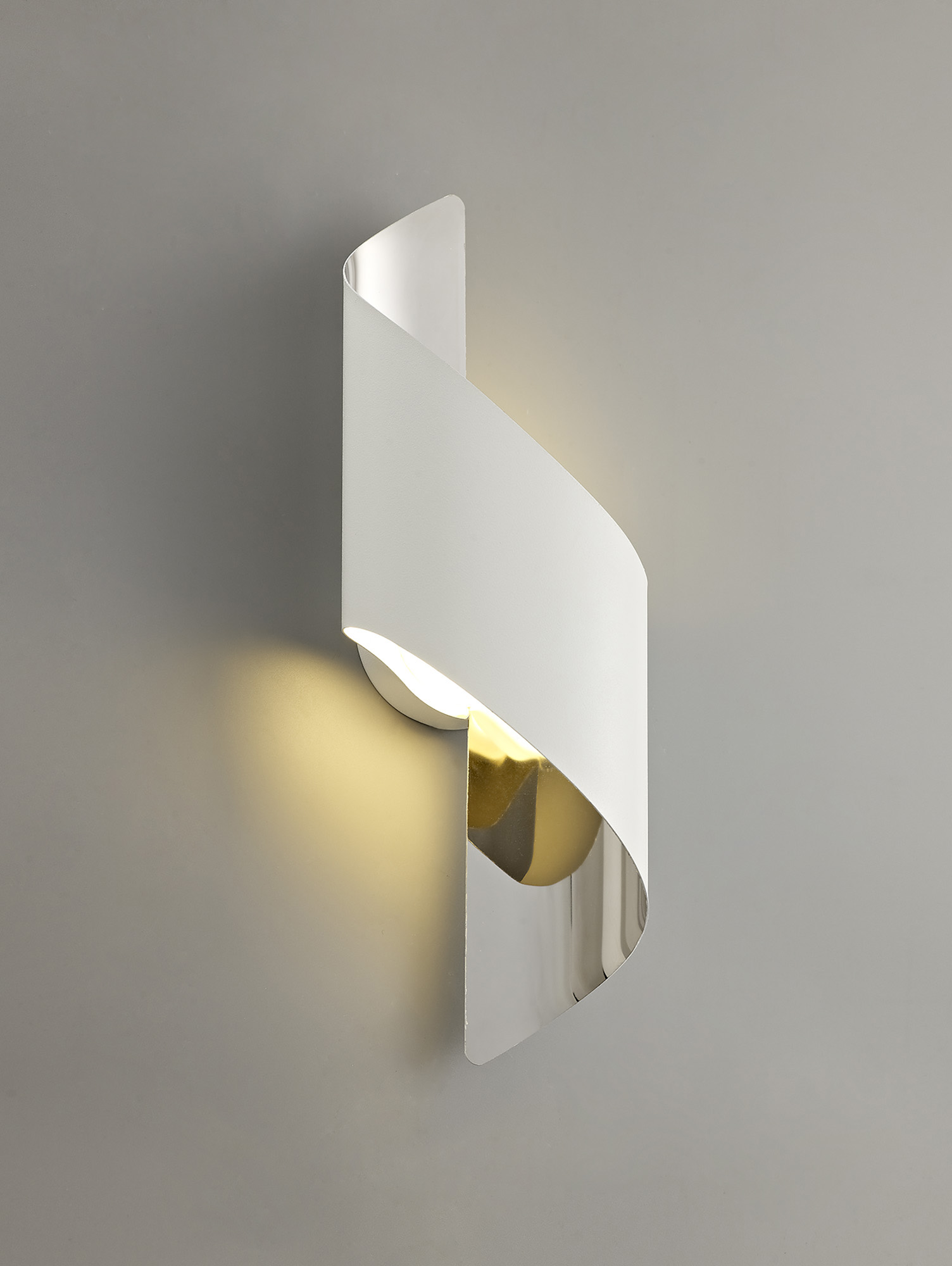 A ultra modern LED Wall light, Angled & fashioned into a spiral shape. finished in white & chrome