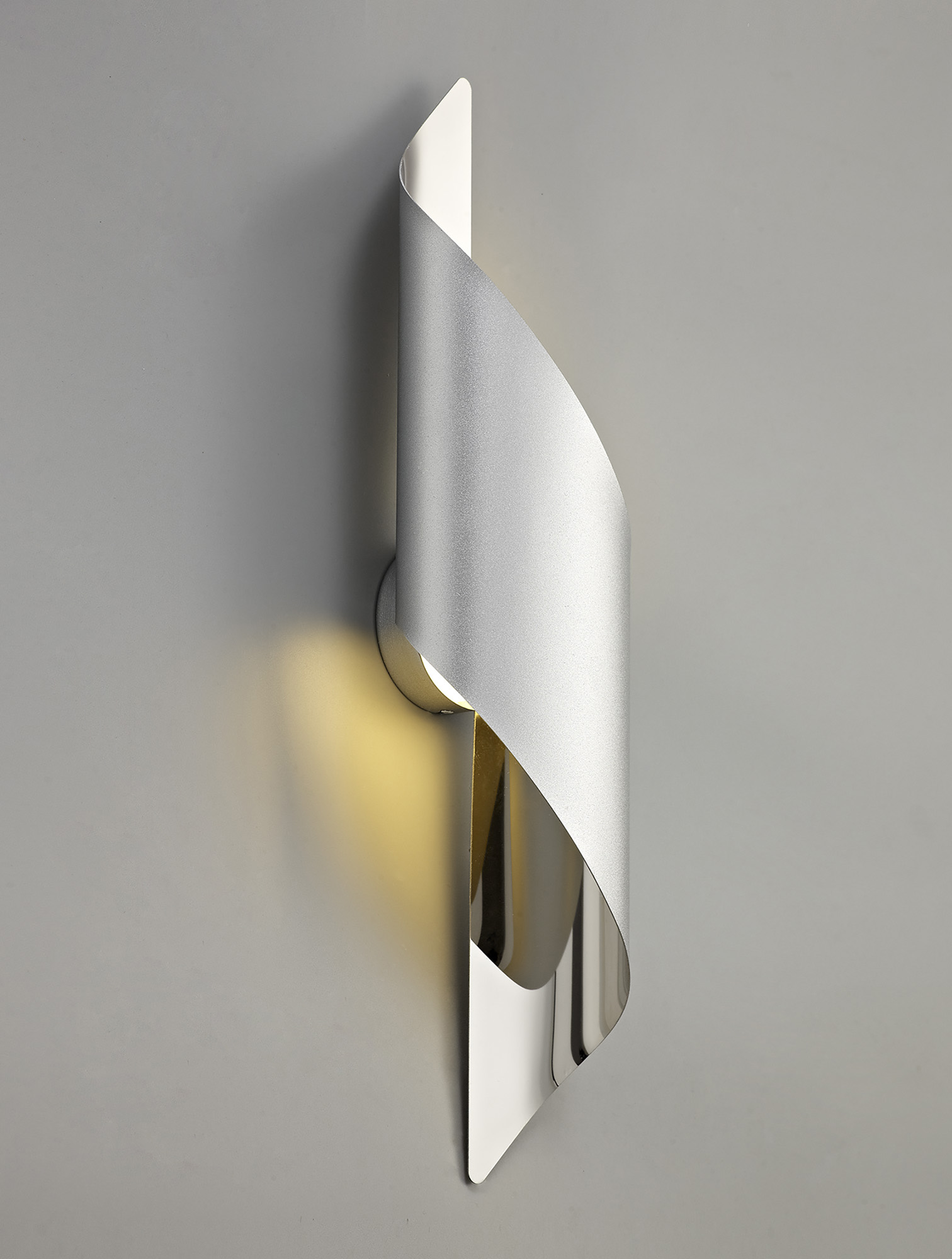 A ultra modern LED Wall light, Angled & fashioned into a spiral shape. finished in silver & chrome