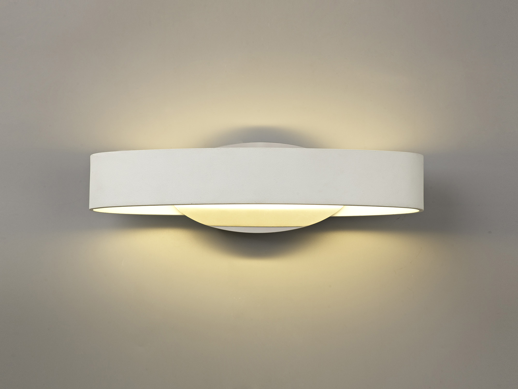 A hollowed belt shape forming the framework creates an enhanced halo effect of the 3000K LEDs. The optional colour finishes available; satin brown or white both harmoniously complement the aura of warm light illuminating the area.