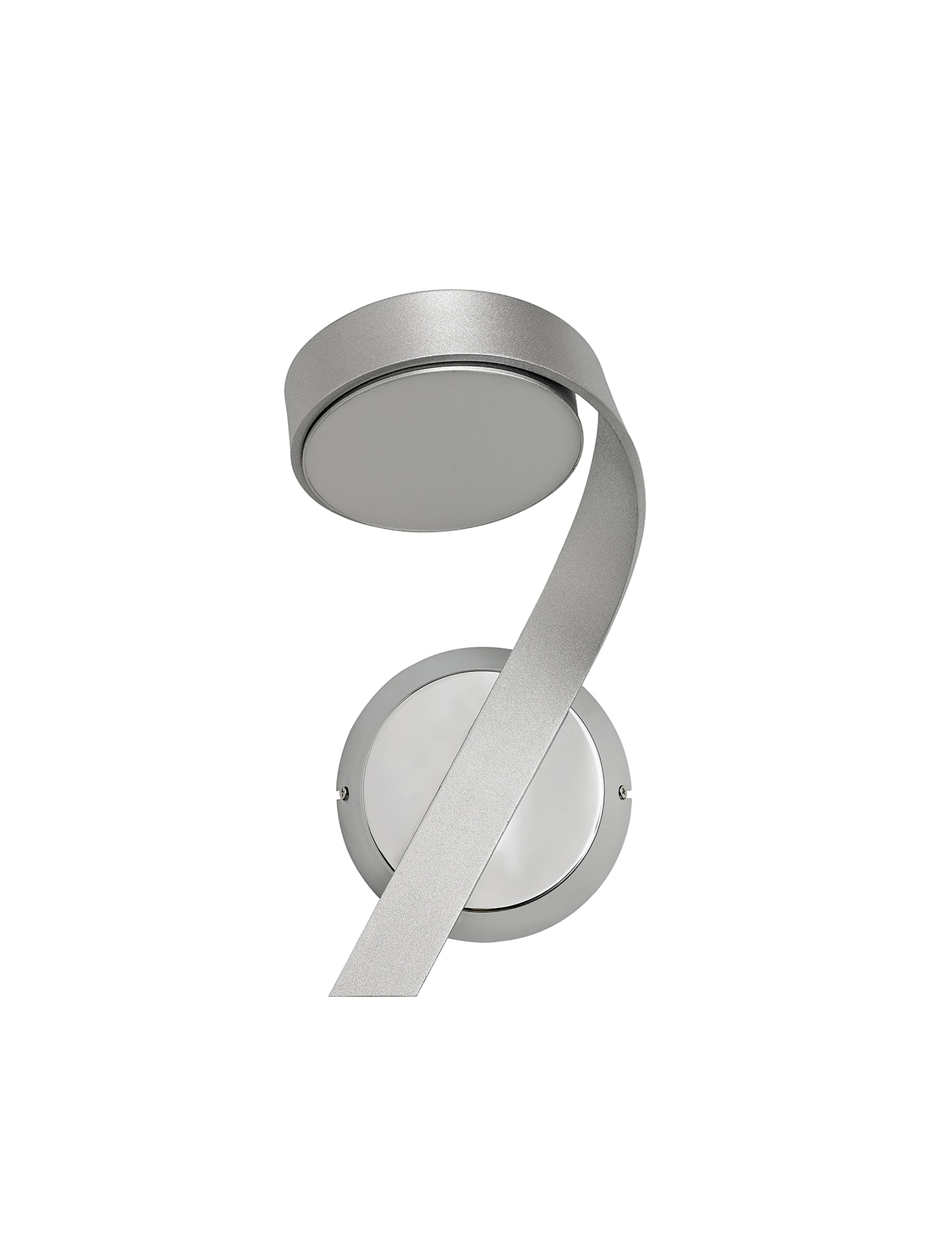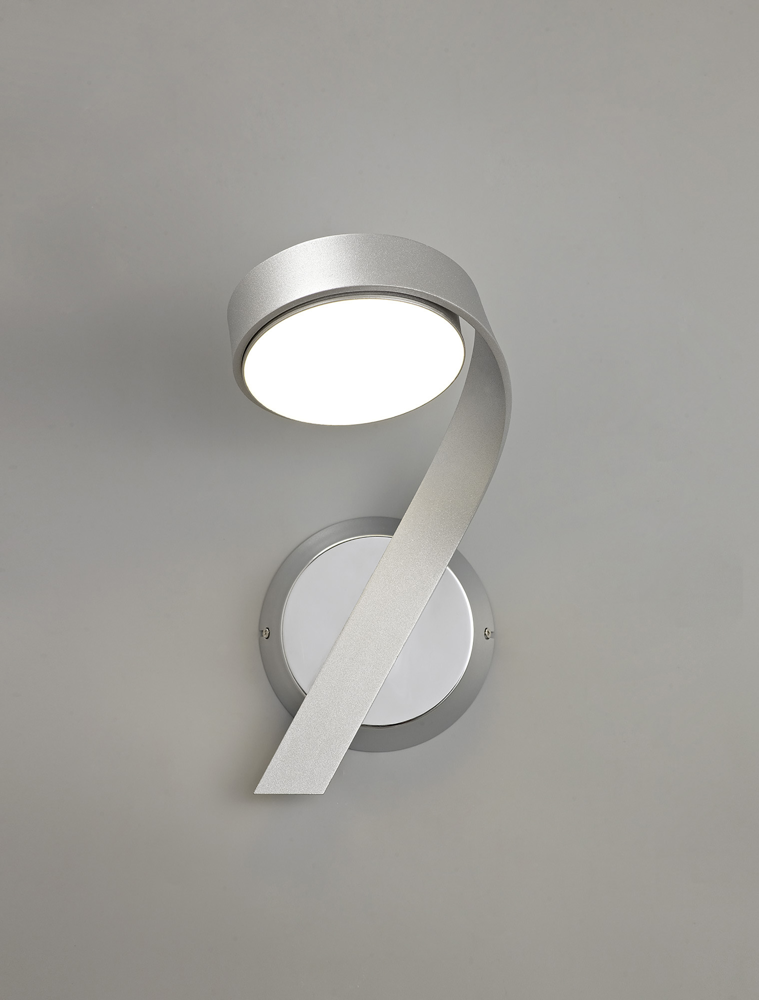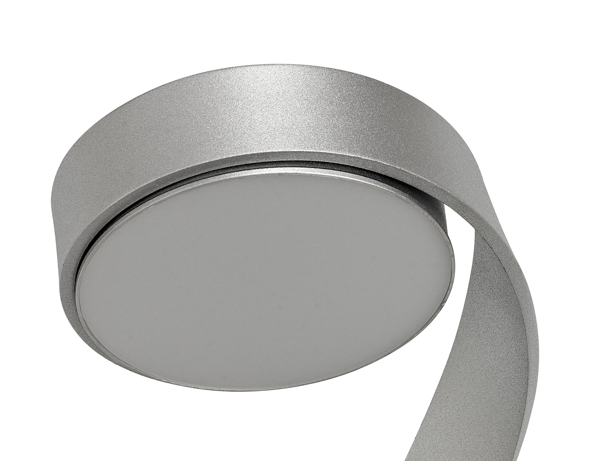 Silver framework manipulated to reflect lengths of ribbon which twist into a ring at the end. These rings encircle the round diffuser disk that houses the integral 3000K LEDs. The flat disk surface dispels the optimum amount of light possible to ensure there is no waste from the high wattage LEDs.
