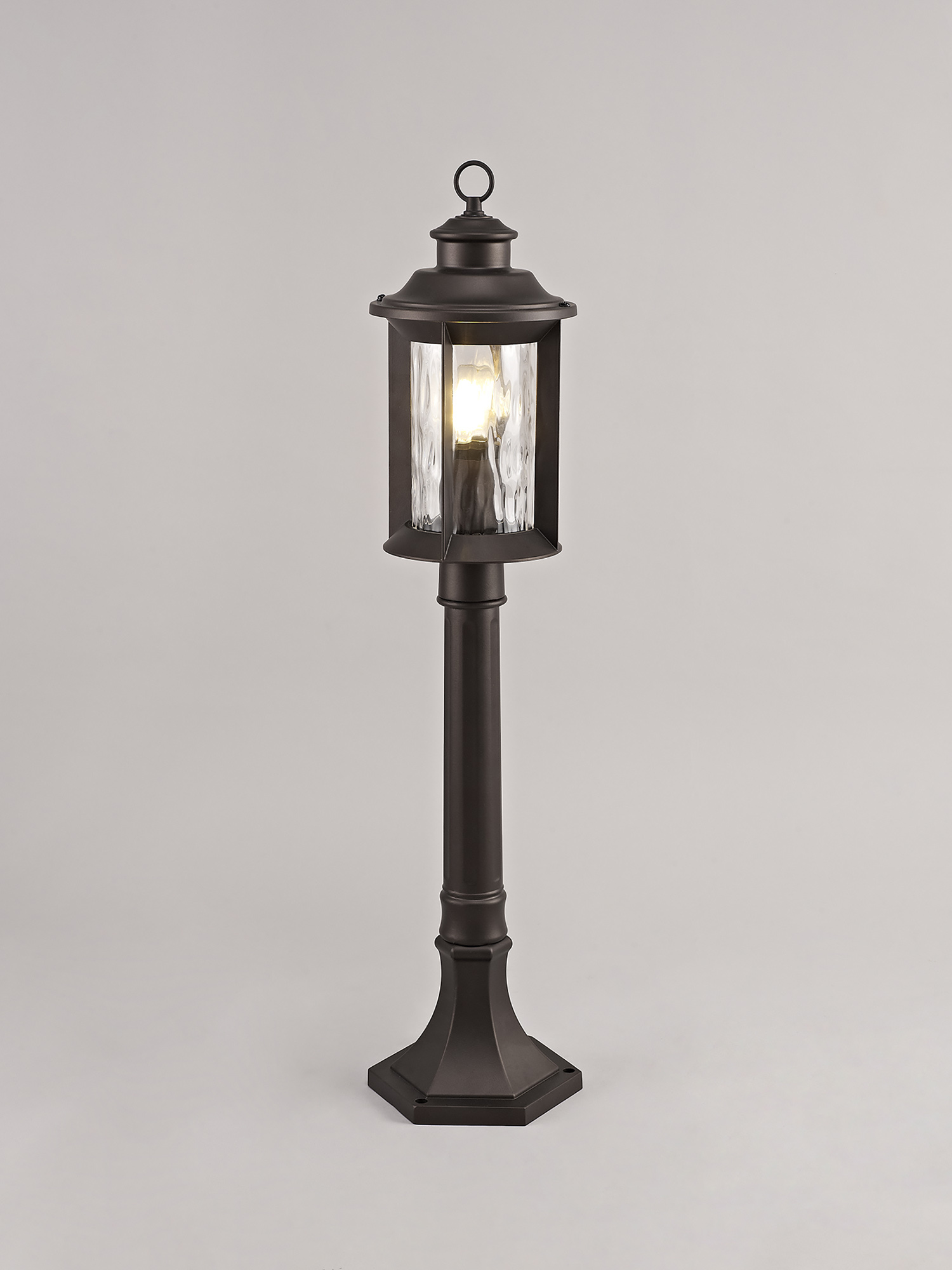 This outdoor collection the Ella fixtures are coated in an antique bronze colour finish to complement the vintage lantern style of the hanging wall lamp, post and pedestal lamps.