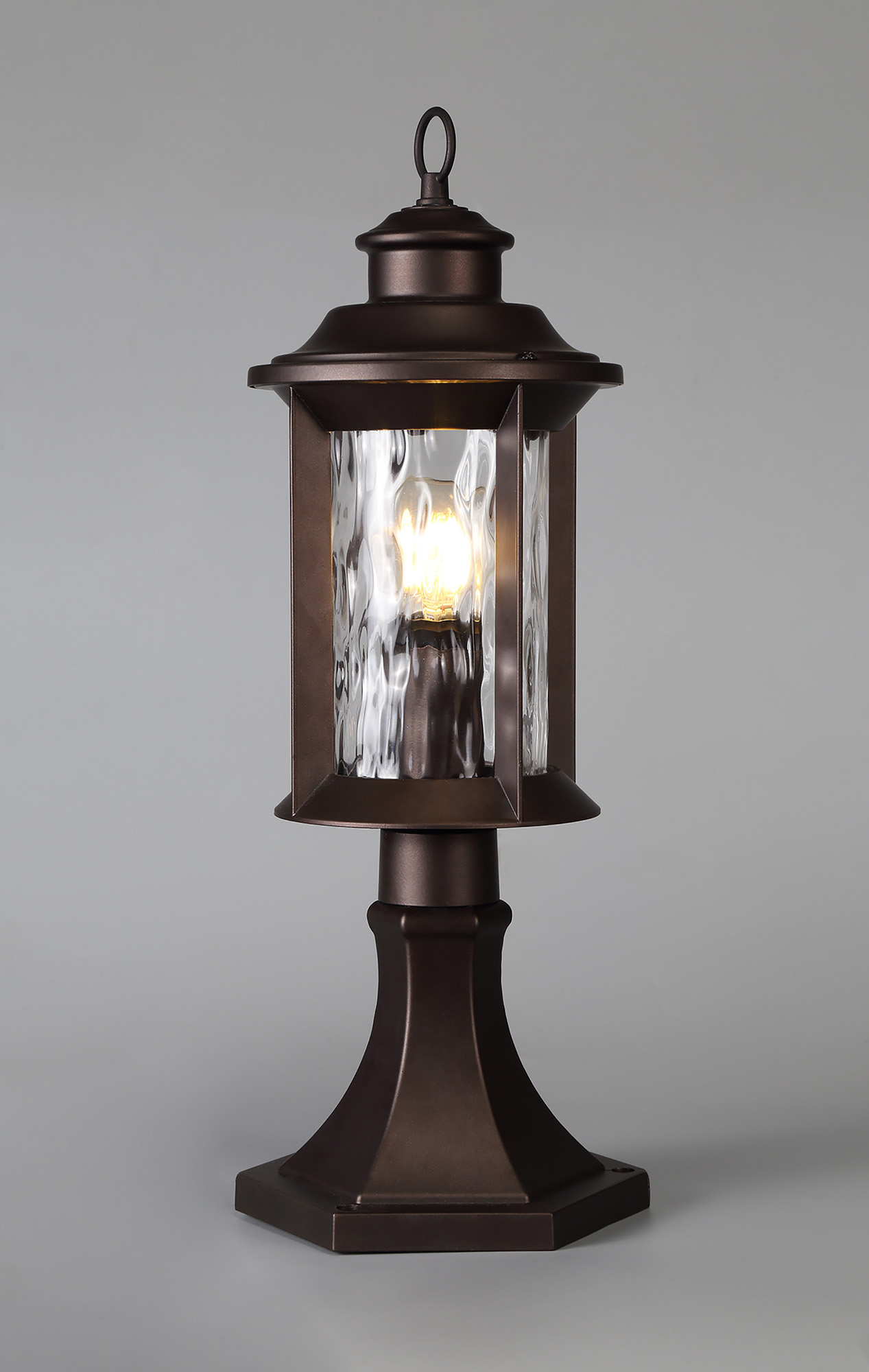 This outdoor collection the Ella fixtures are coated in an antique bronze colour finish to complement the vintage lantern style of the hanging wall lamp, post and pedestal lamps.