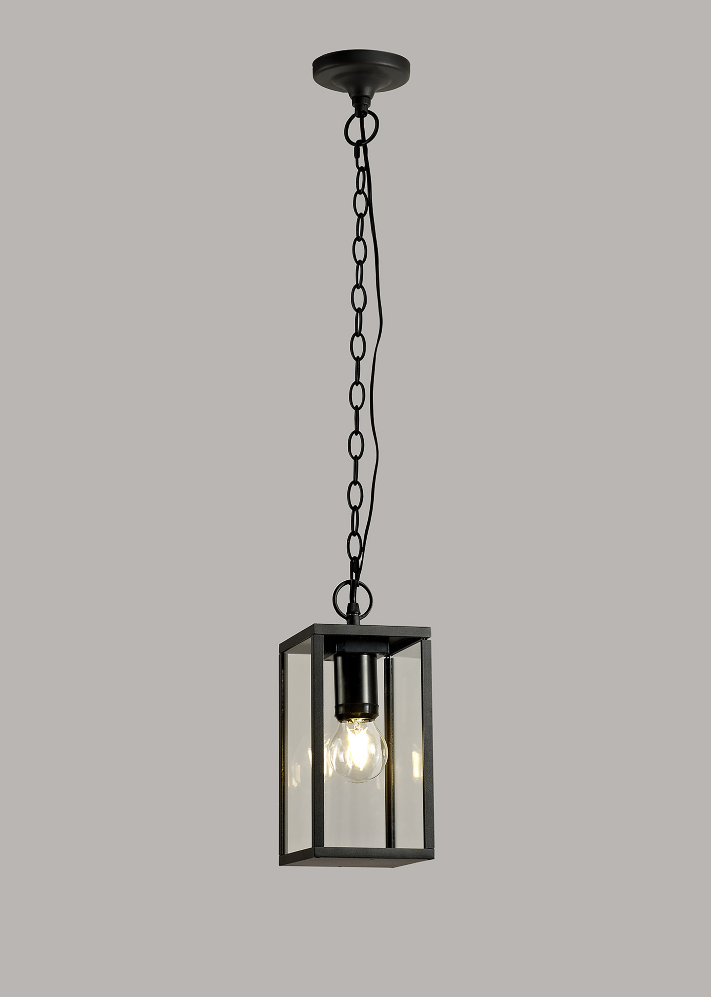 The three dimensional rectangular frames with glass panels on each side reflect an old-fashioned oil lantern which is most prominently featured on the downward wall lamp with its curved hanging arm. A graphite black colour finish was selected during the design process to ensure the collection offers extended durability and longevity. With a wide selection of lighting fixtures