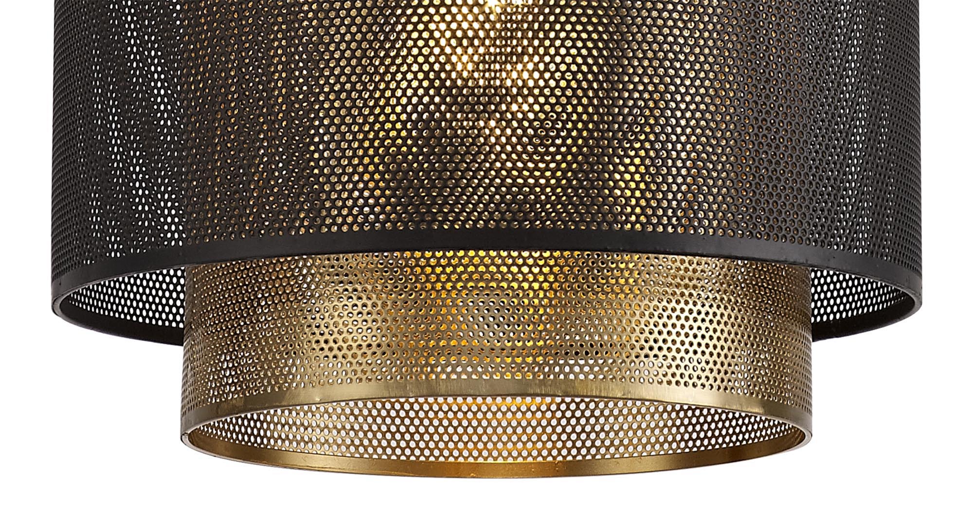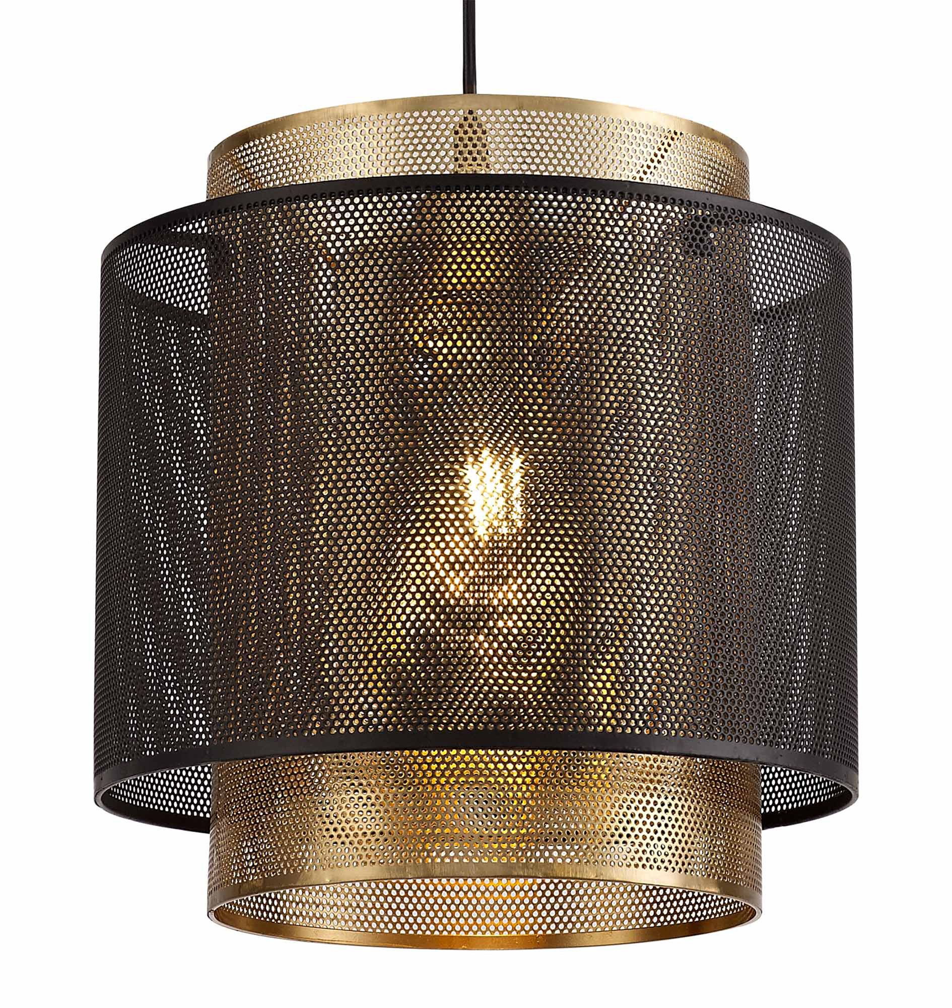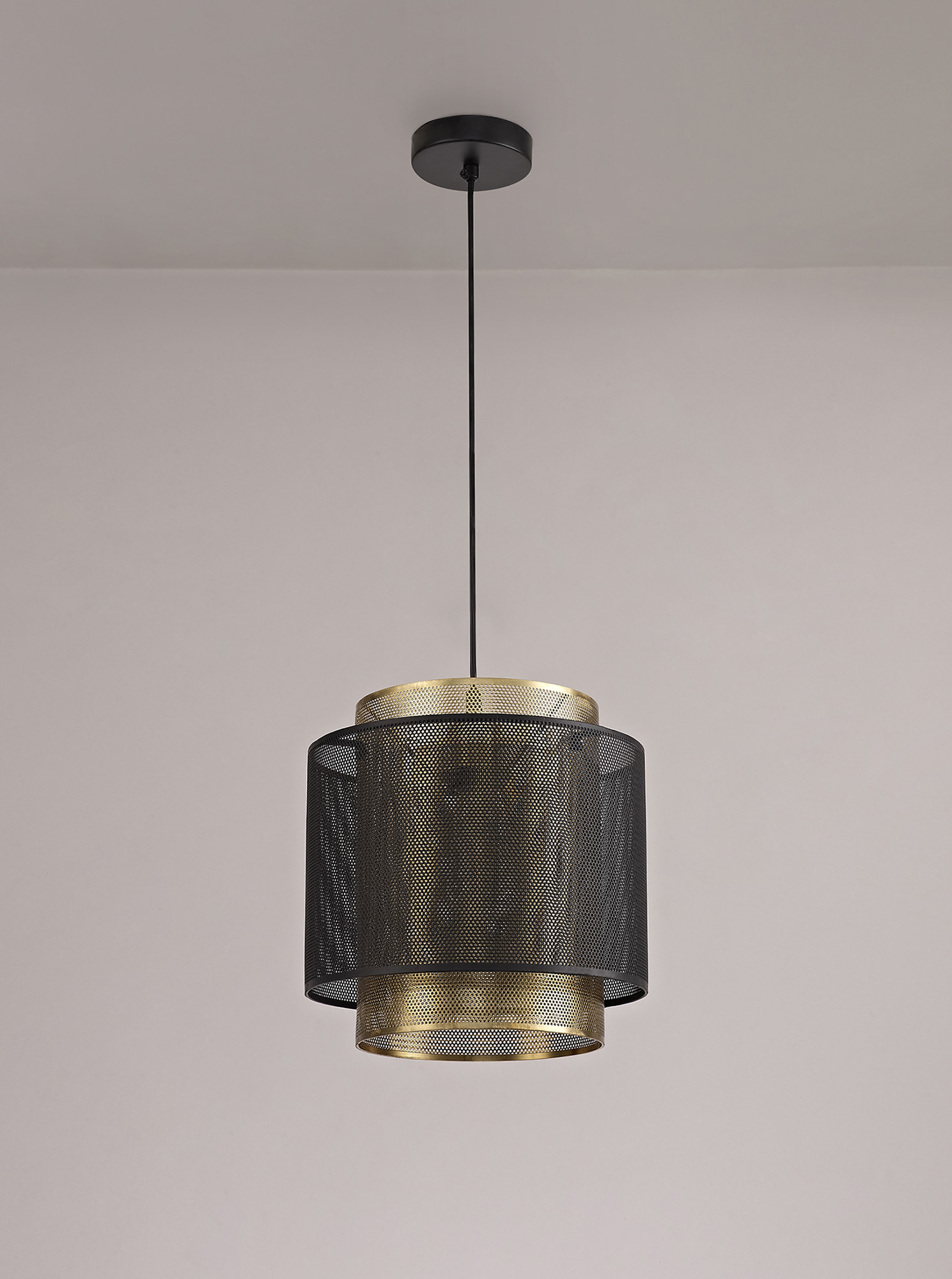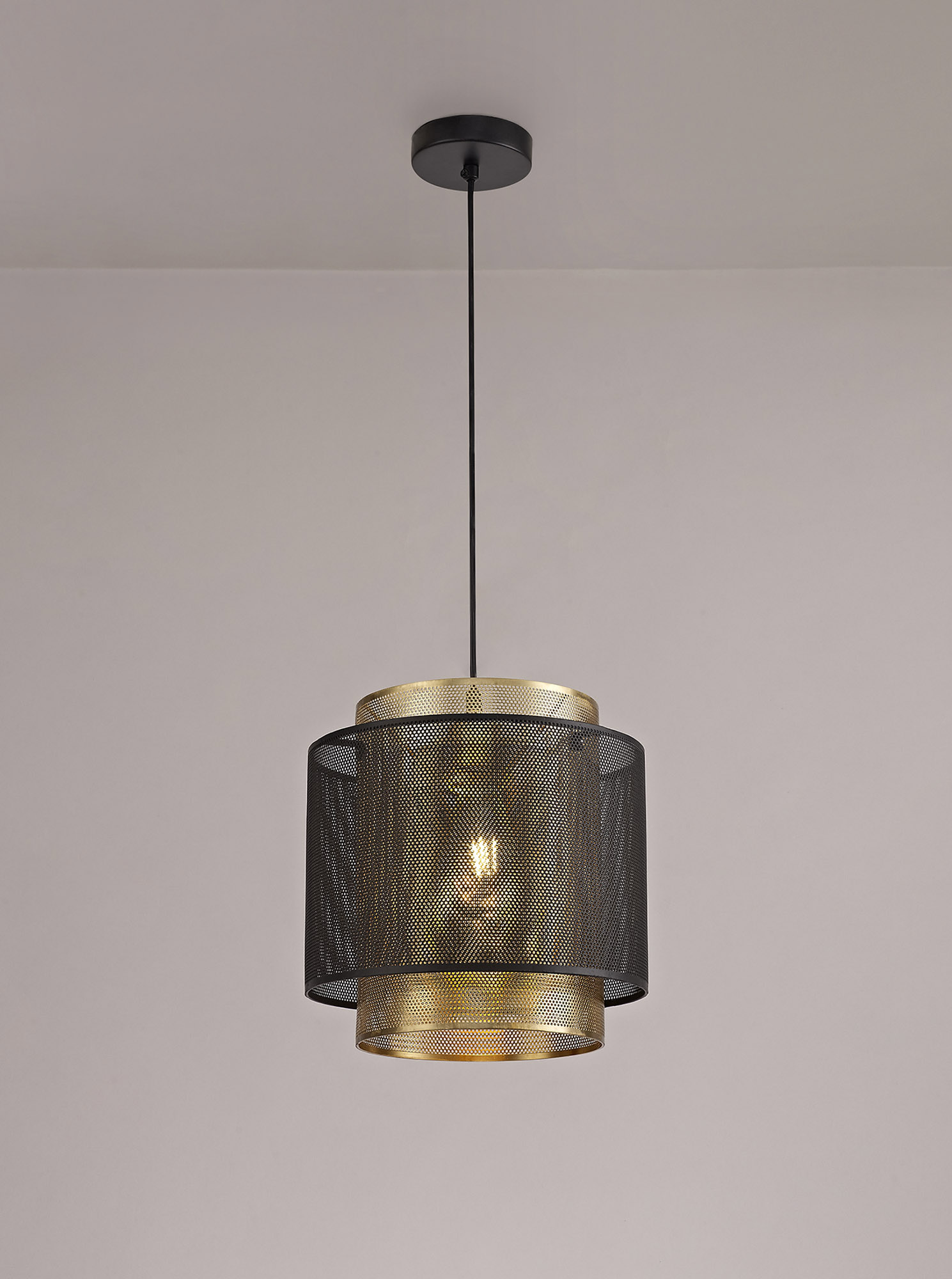 An urban, industrial tone is inspired by these single pendants. Available in a large or small version the overlapping cylindrical forms are composed from sheets of mesh metal pieces. The tall narrow inner cylinder is a satin gold finish and the contrasting outer ring is shorter with a matt black finish. Each pendant takes a maximum 60W E27 lamp.