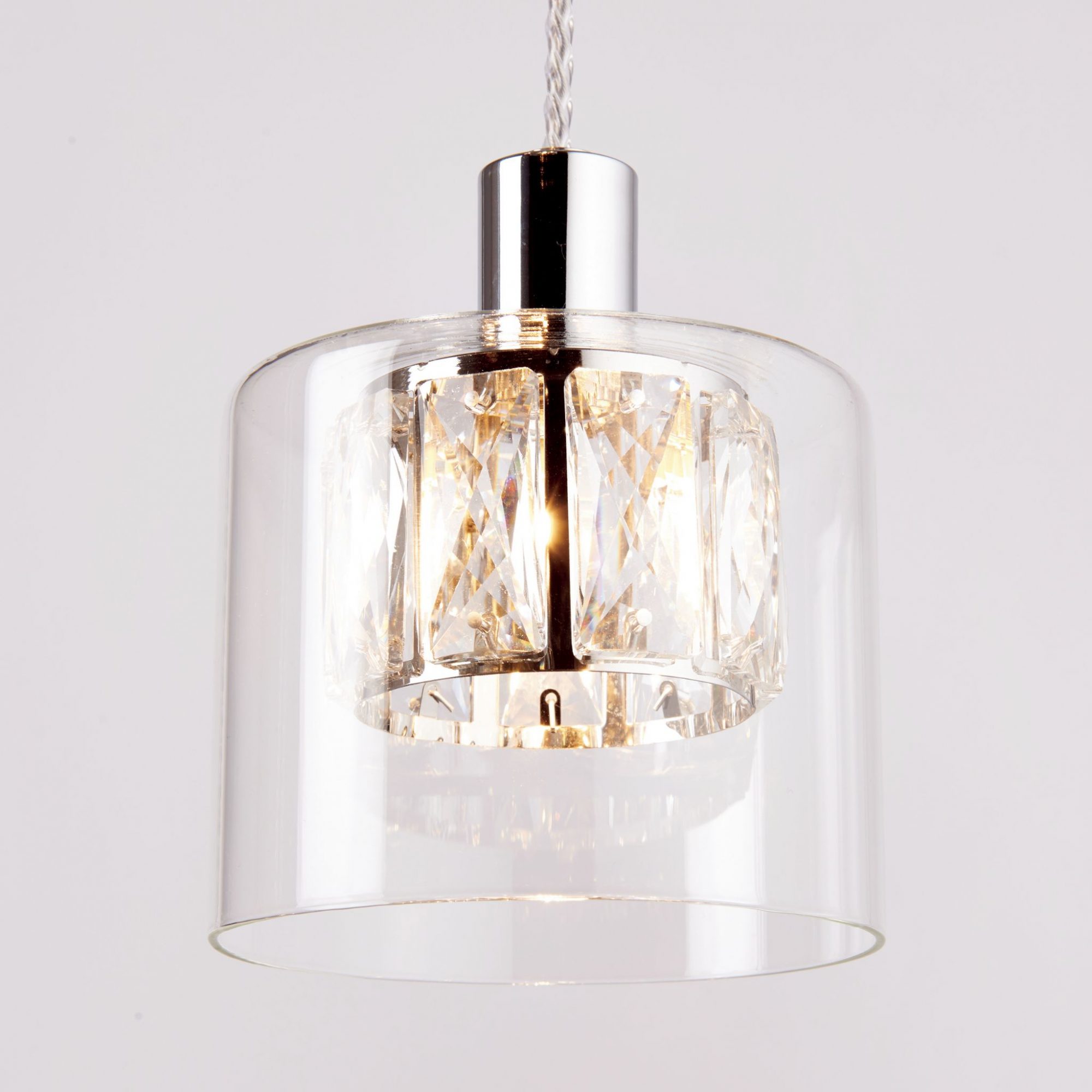 High quality clear crystals adorn this deluxe chrome plated multi pendant, the crystal shades are enclosed by beautiful clear glass diffusers, each suspended on height adjustable clear flex. The combination of clear crystals, polished chrome and glass create a luxurious interior decorative pendant light.