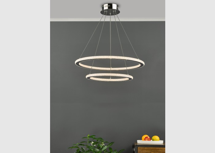 The Orion Pendant is a highly versatile and energy efficient LED pendant. Featuring two rings of crystal-like acrylic and polished chrome suspended from fine metal cables. The Orion Pendant can be adjusted in many ways to create a unique floating centrepiece for your living or dining room.