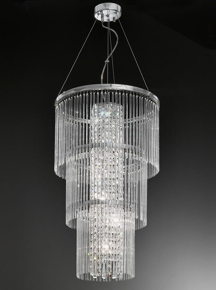 This Stylish Pendant is finished in chrome with glass rods which surround a central colomn made of strings of rectangular crystal drops, At the end of some of the strings there are faceted crystal droplets.