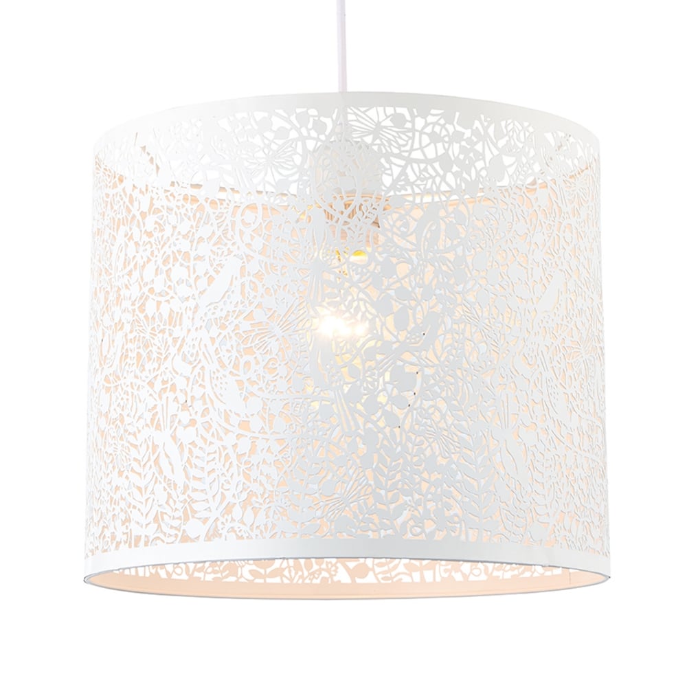 Non-electric pendant designed with a secret garden detailing of leaves, dragonflies and birds, with an white finish. Casts a decorative light pattern.