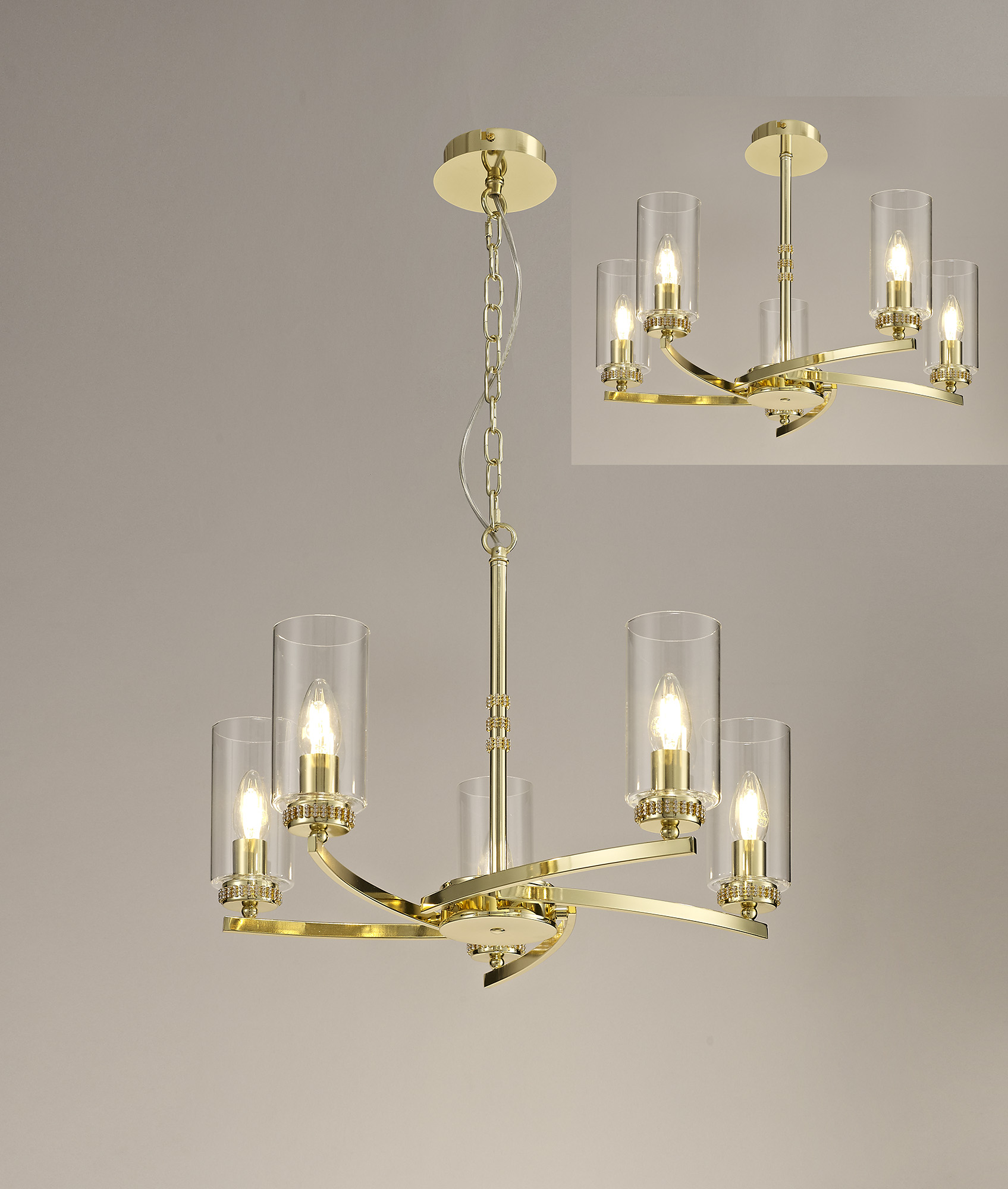 A beautiful range with Polished Gold frame and clear glass tubes with crystal detail.