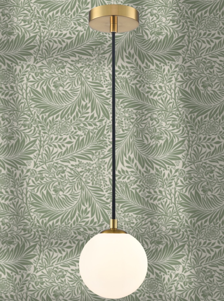 Aged brass finish single pendant with sphere shaped opal glass on a black braided suspension.