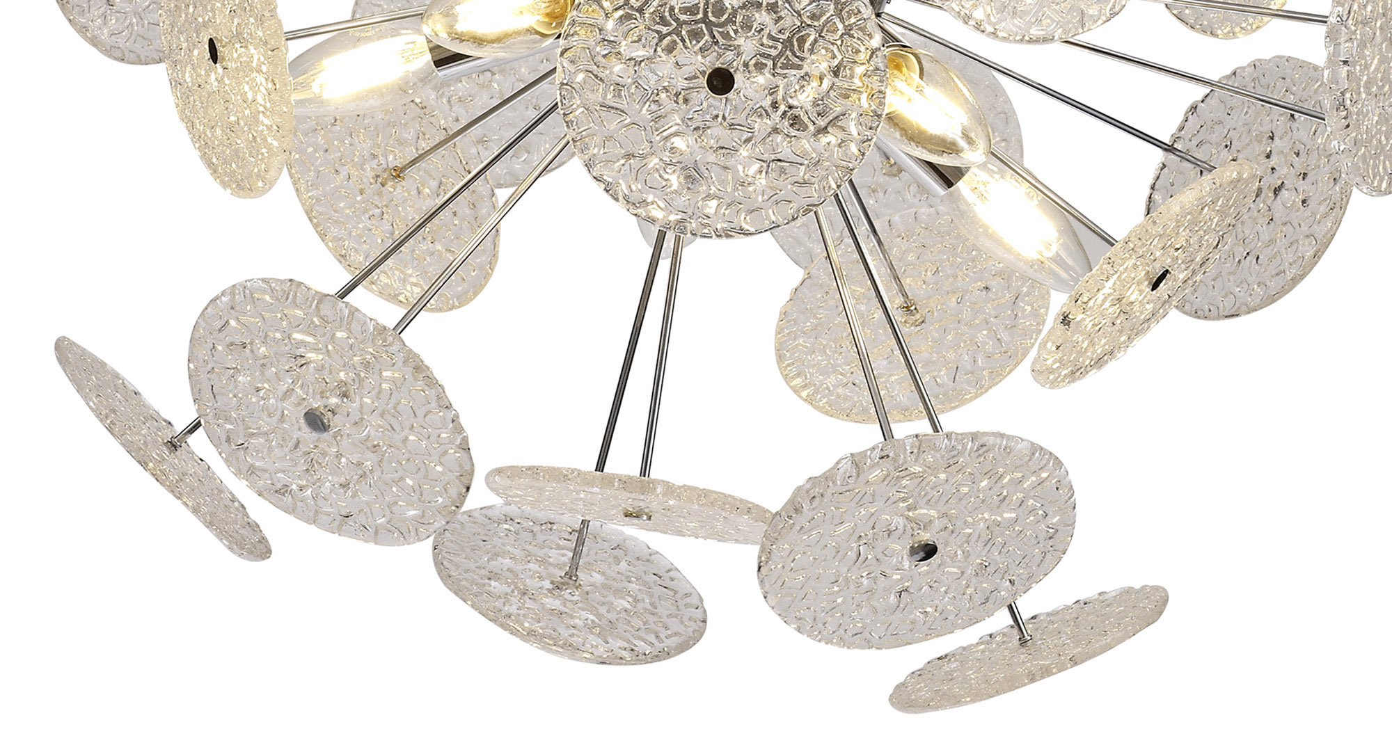 Drawing inspiration from a dandelion plant, our Alana pendant introduces a uniquely creative structure. A spherical central frame hosts a myriad of polished chrome rods at different lengths with glass disks, producing depth and dimension. The intricate pattern of the handmade glass adds further character to this stylish lighting solution.