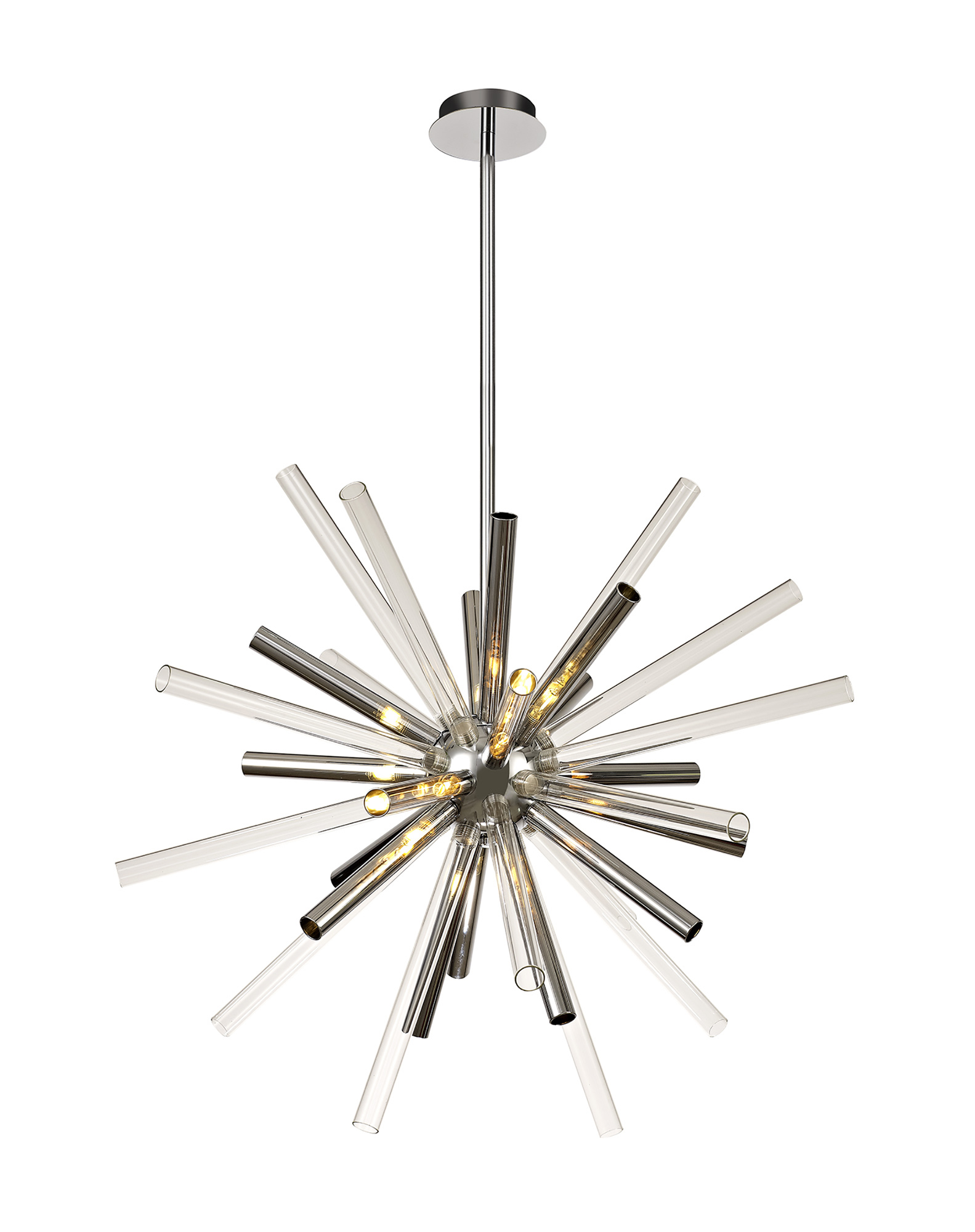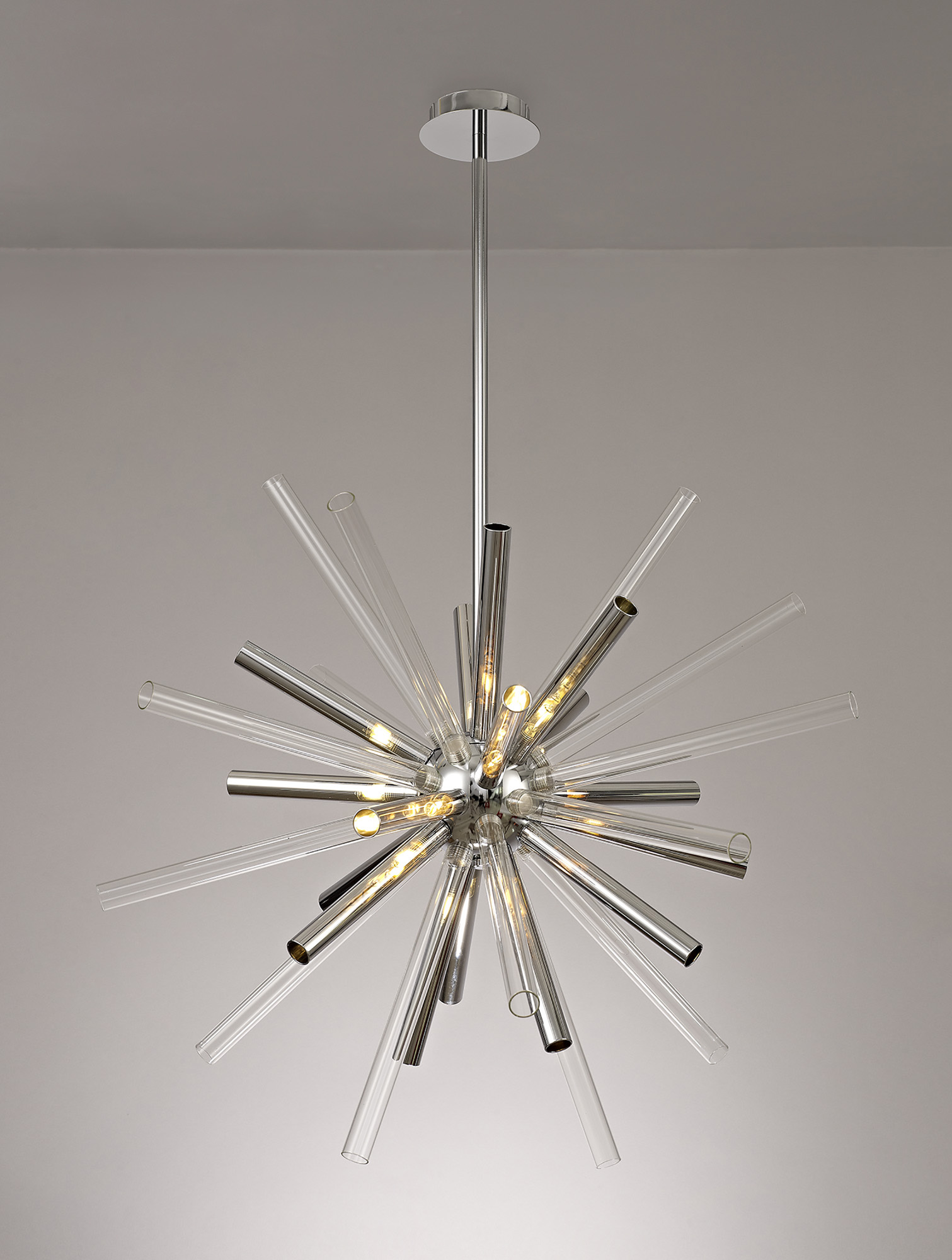 Rods has an abundance of narrow glass tubes in various sizes which are cleverly arranged into a sputnik composition, devising a larger three dimensional effect around the polished chrome central orb frame. complete With Smoked & clear glass tubes.