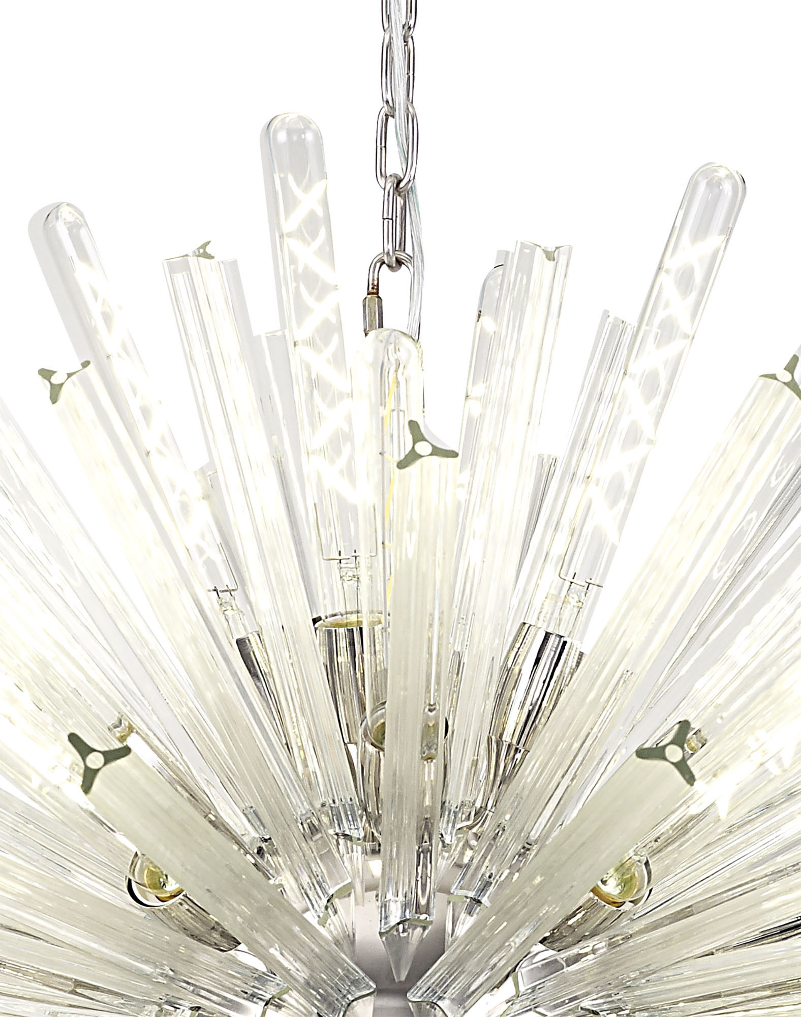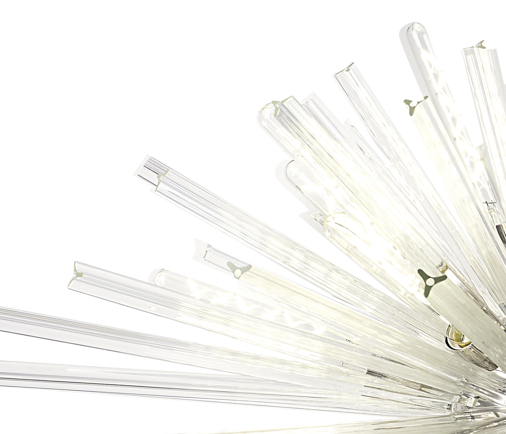 The Cleo collection presents an intriguing glass shape moulded into a three dimensional triquetra. The grooves along each sized glass create an appealing optical effect which is effortlessly enhanced with the use of tubular lamps.