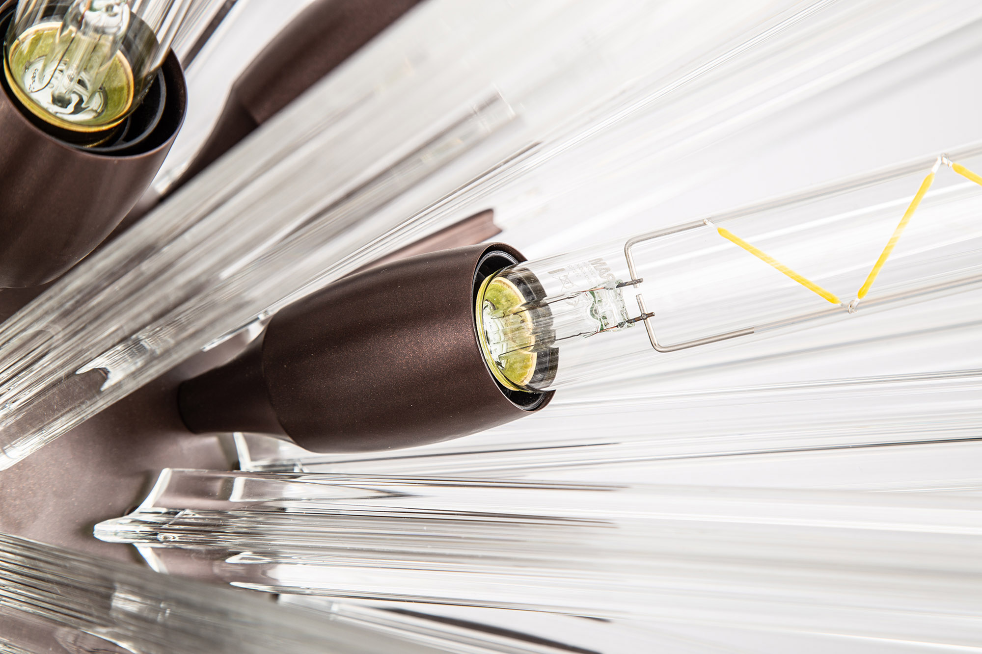 The Cleo collection presents an intriguing glass shape moulded into a three dimensional triquetra. The grooves along each sized glass create an appealing optical effect which is effortlessly enhanced with the use of tubular lamps.