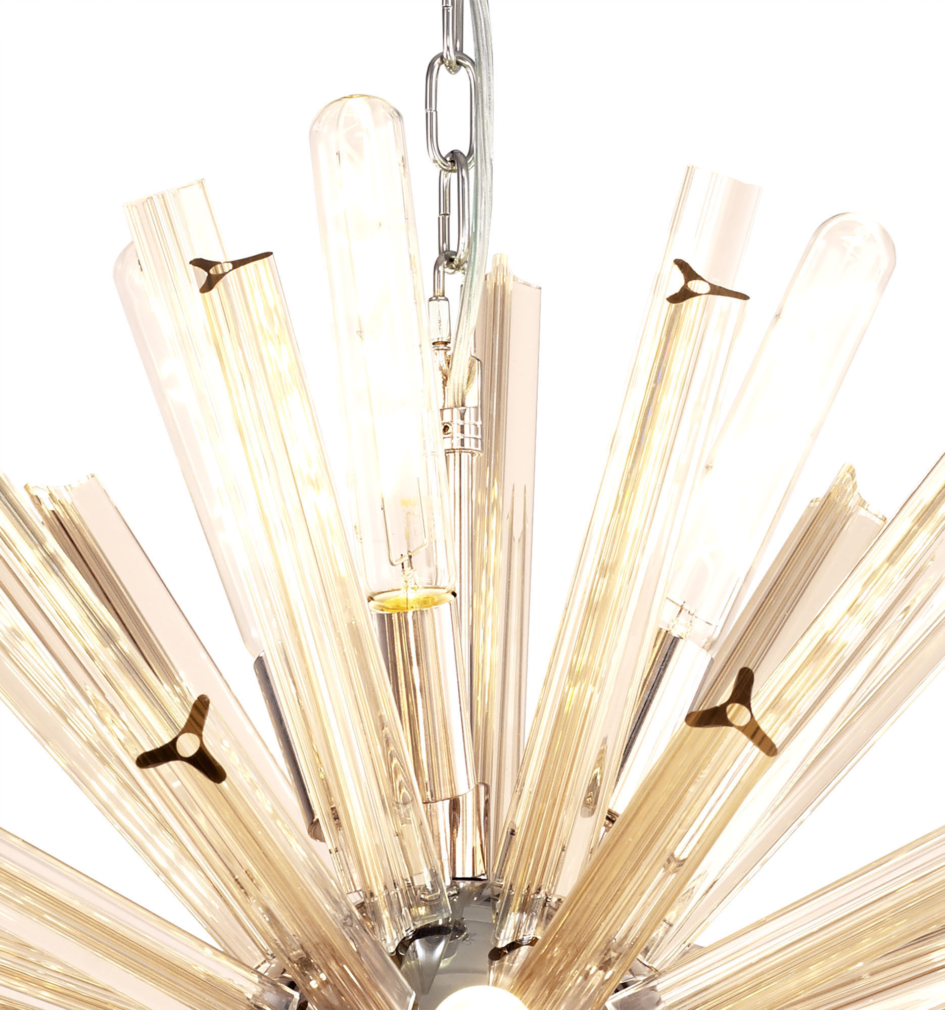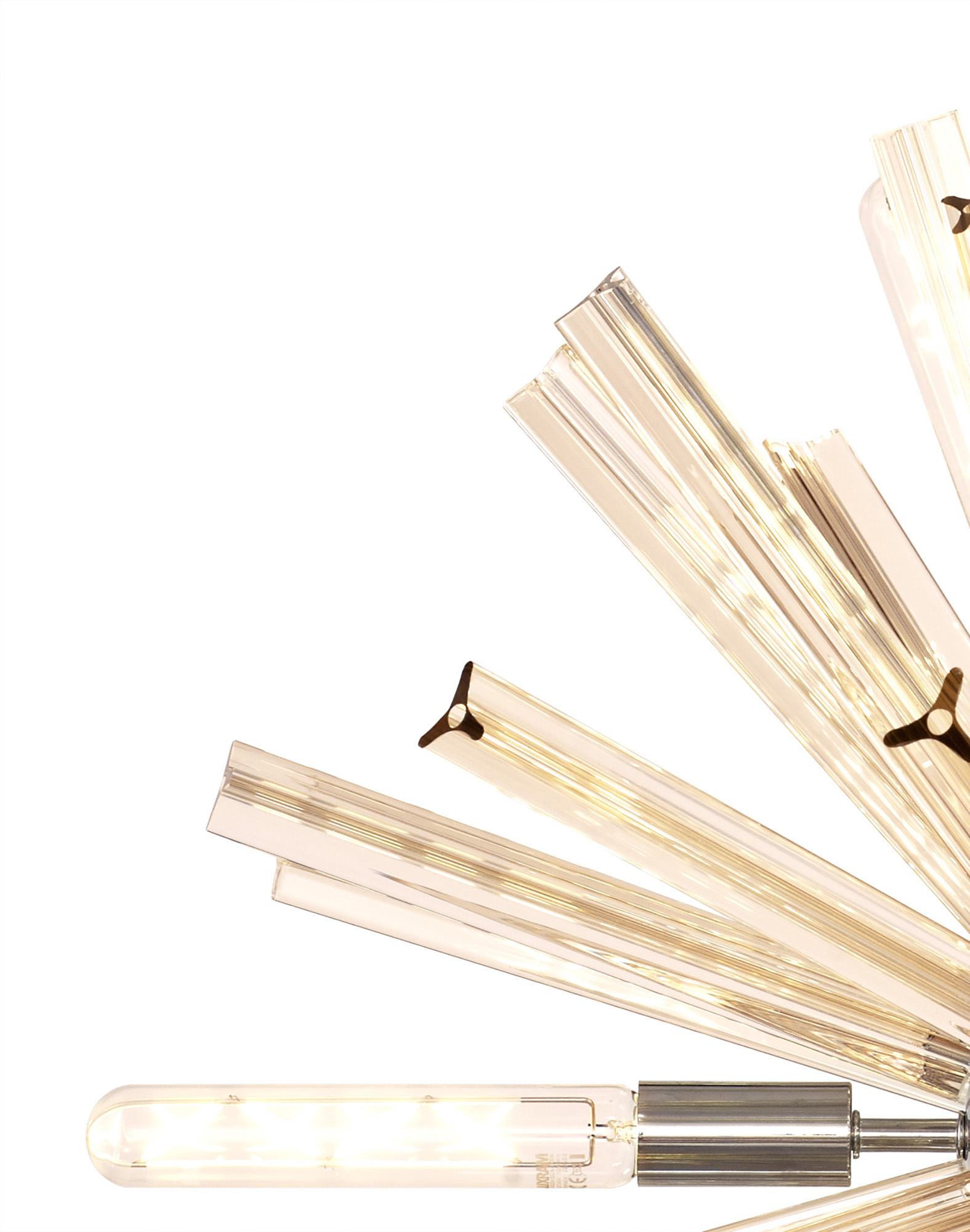 The Cleo collection presents an intriguing glass shape moulded into a three dimensional triquetra. The grooves along each sized glass create an appealing optical effect which is effortlessly enhanced with the use of tubular lamps.