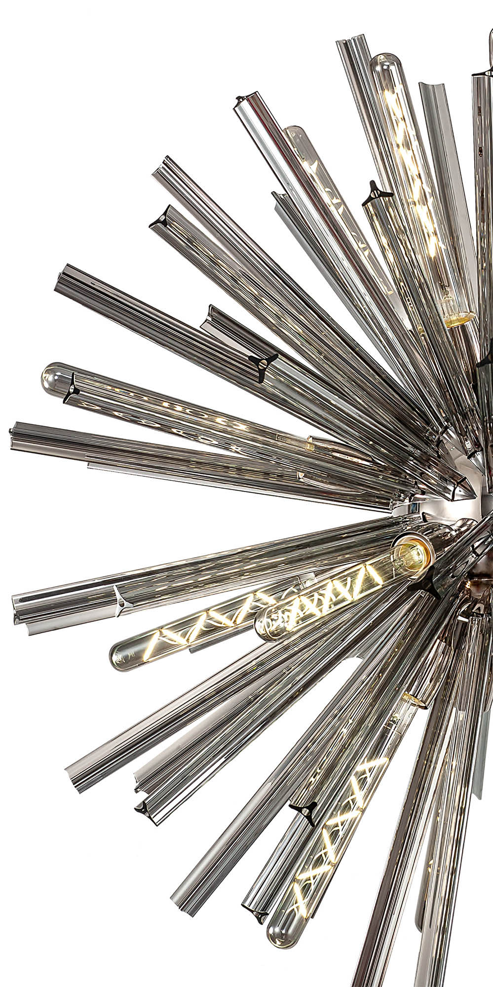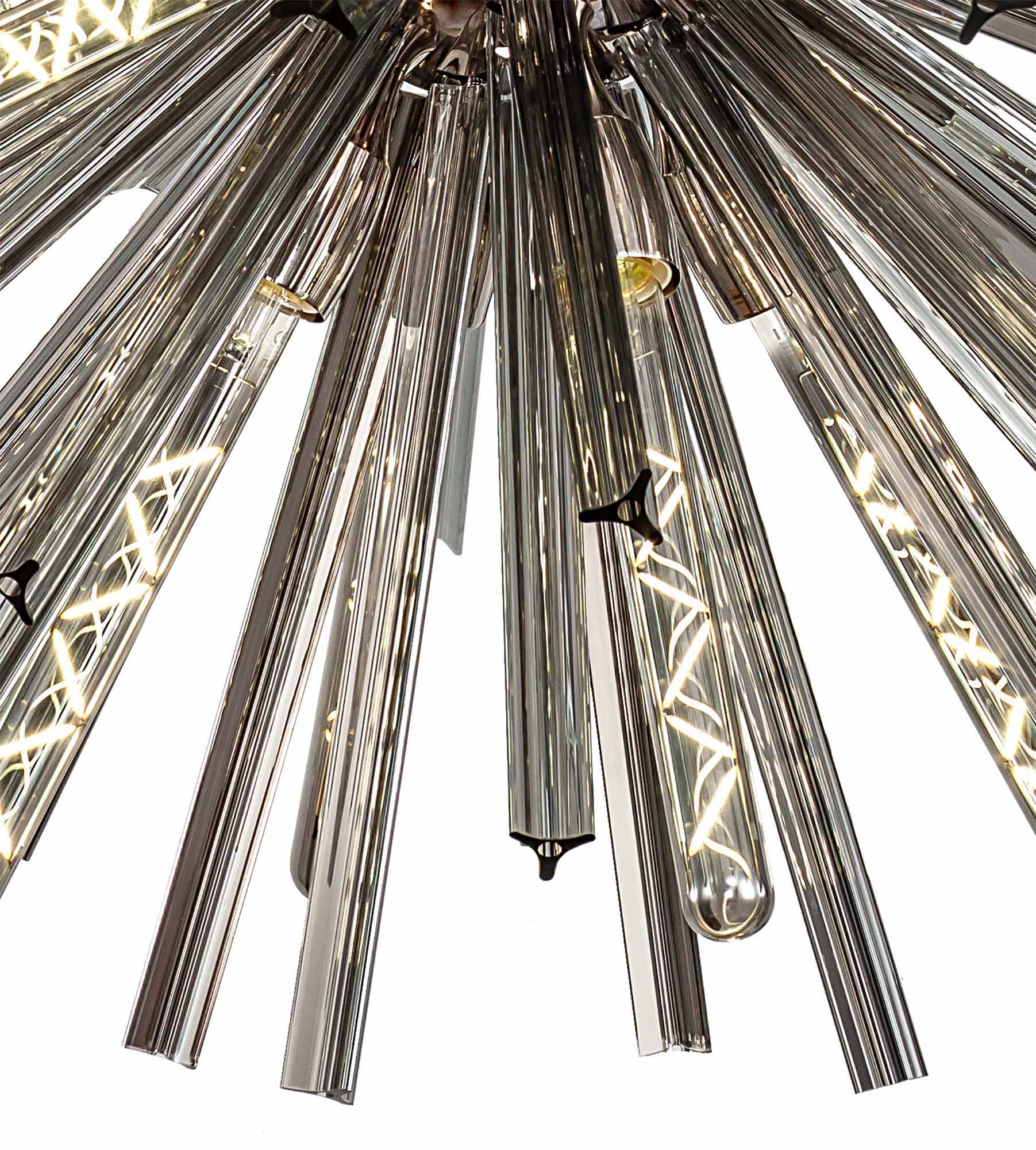 The Cleo collection presents an intriguing glass shape moulded into a three dimensional triquetra. The grooves along each sized glass create an appealing optical effect which is effortlessly enhanced with the use of tubular lamps.