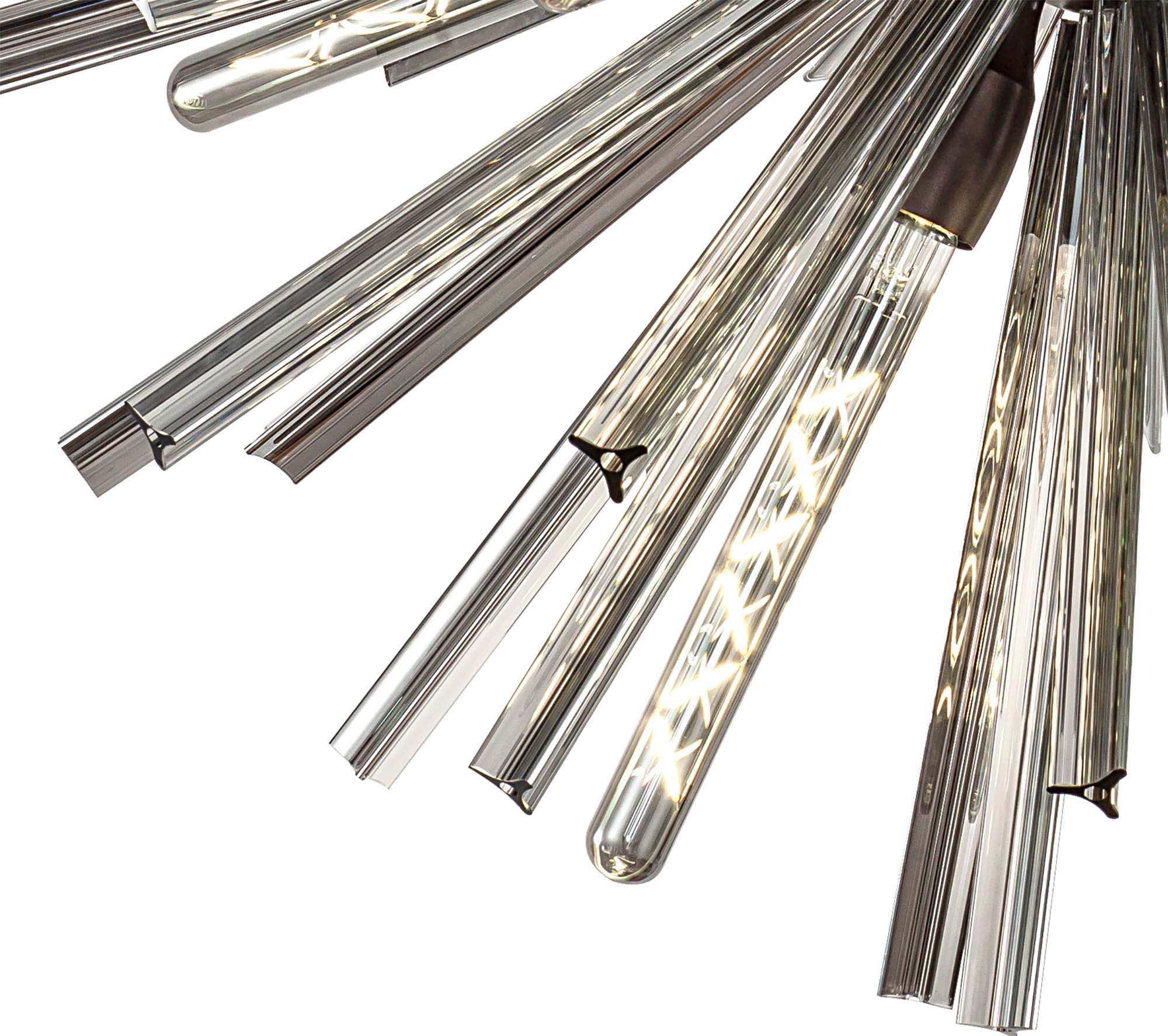 The Cleo collection presents an intriguing glass shape moulded into a three dimensional triquetra. The grooves along each sized glass create an appealing optical effect which is effortlessly enhanced with the use of tubular lamps.
