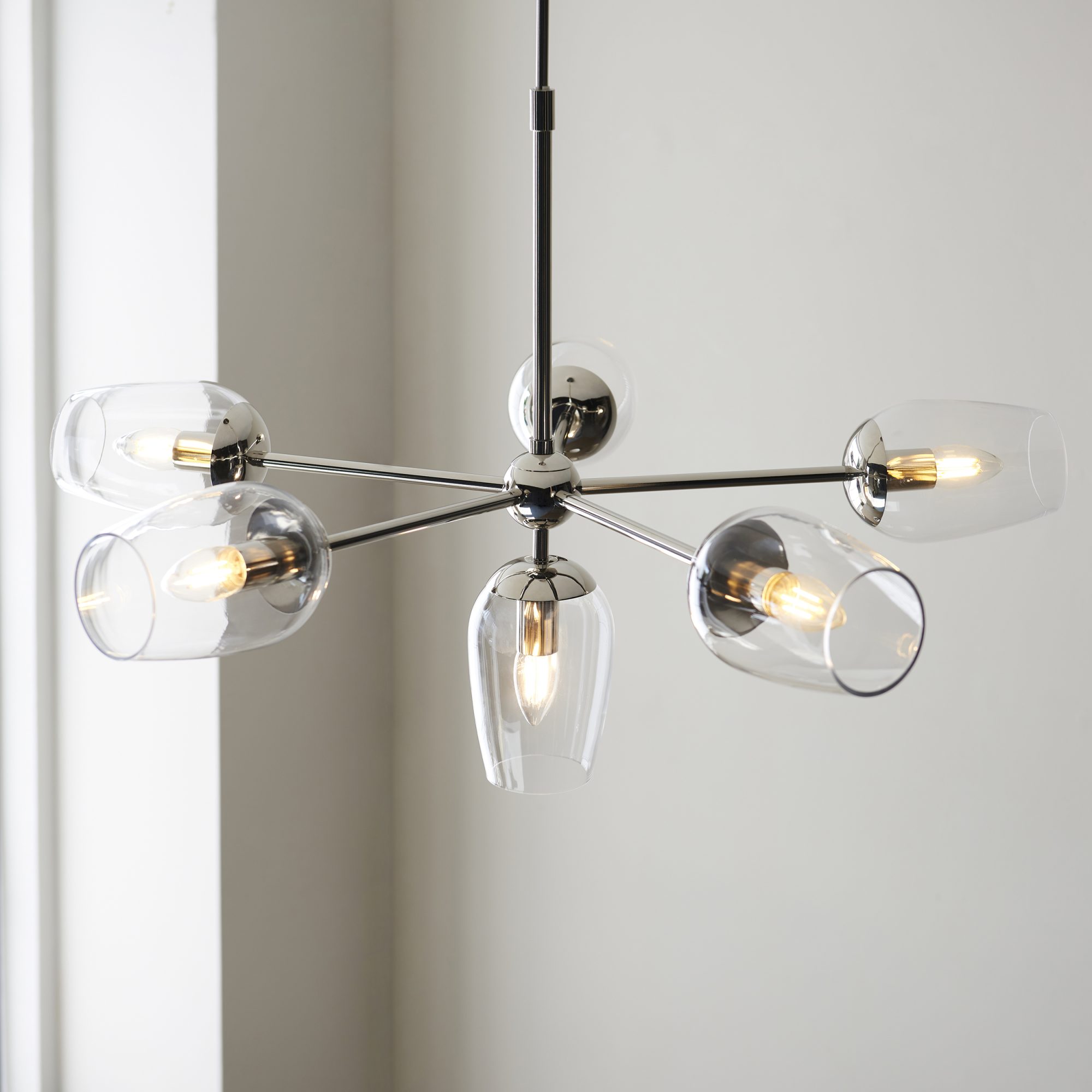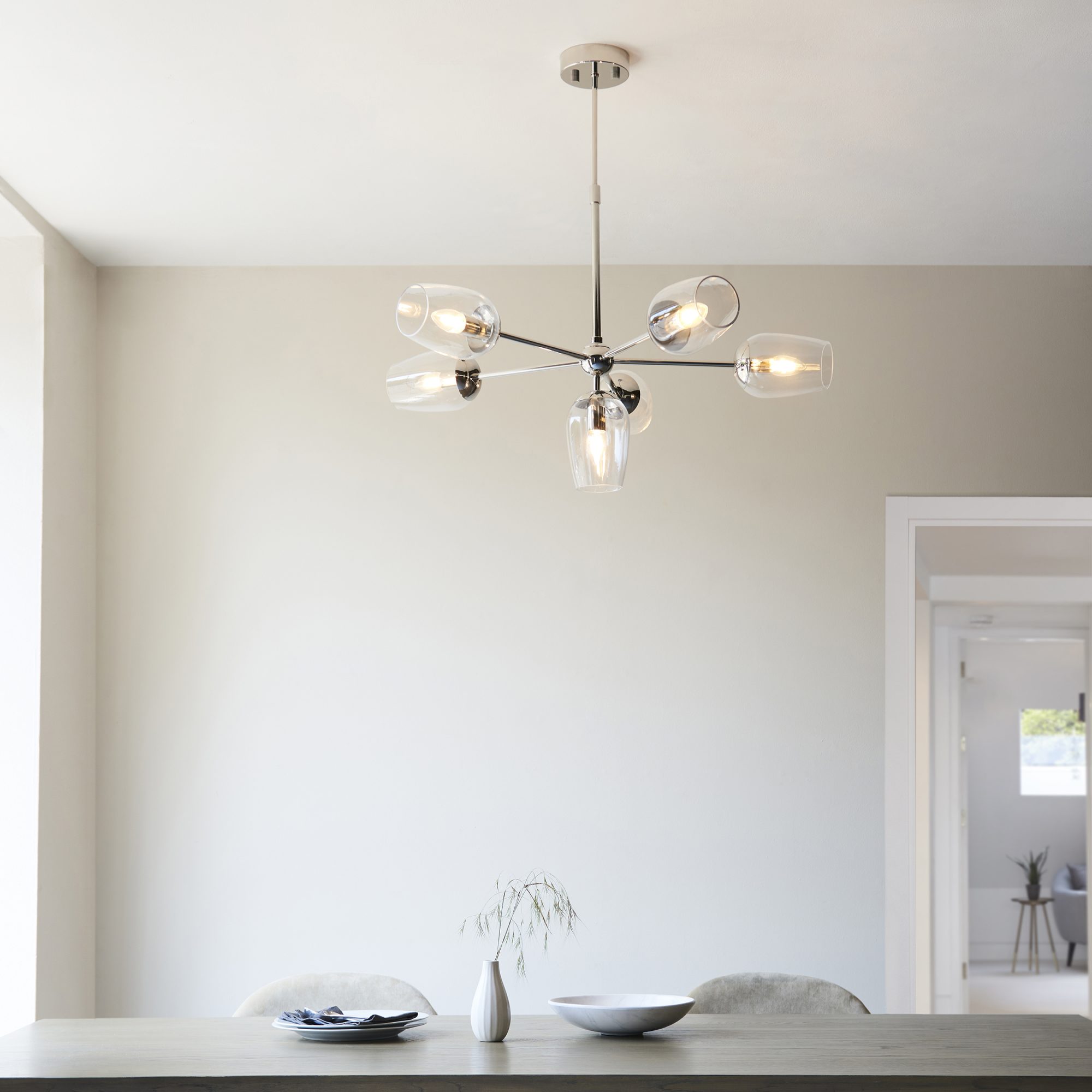 A 6 arm ceiling pendant polished nickel, which is adjustable via telescopic stem, finished off with clear hand blown glass. Ideal for kitchen islands or dining room tables.