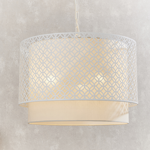 A beautiful chalk white and light grey shade 3-light pendant in a layered 2-tier design with an intricate laser-cut outer shade creating a soft diffused light effect.
