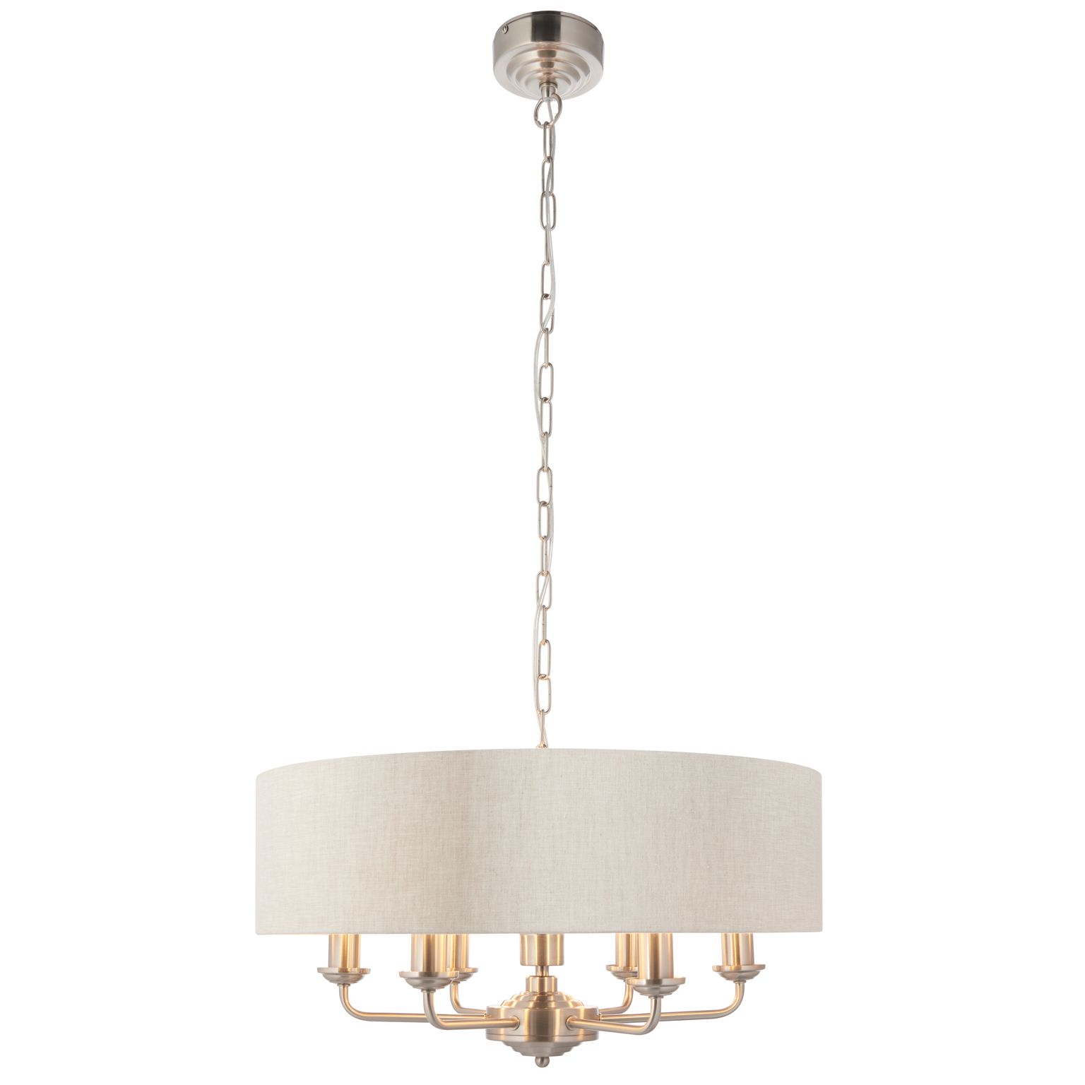 This 6 Light pendant is a sophisticated combination of natural linen mix fabric with reflective metallic inner and brushed Chrome plated metalwork. This statement light is the perfect timeless addition to modern and classic homes of today.