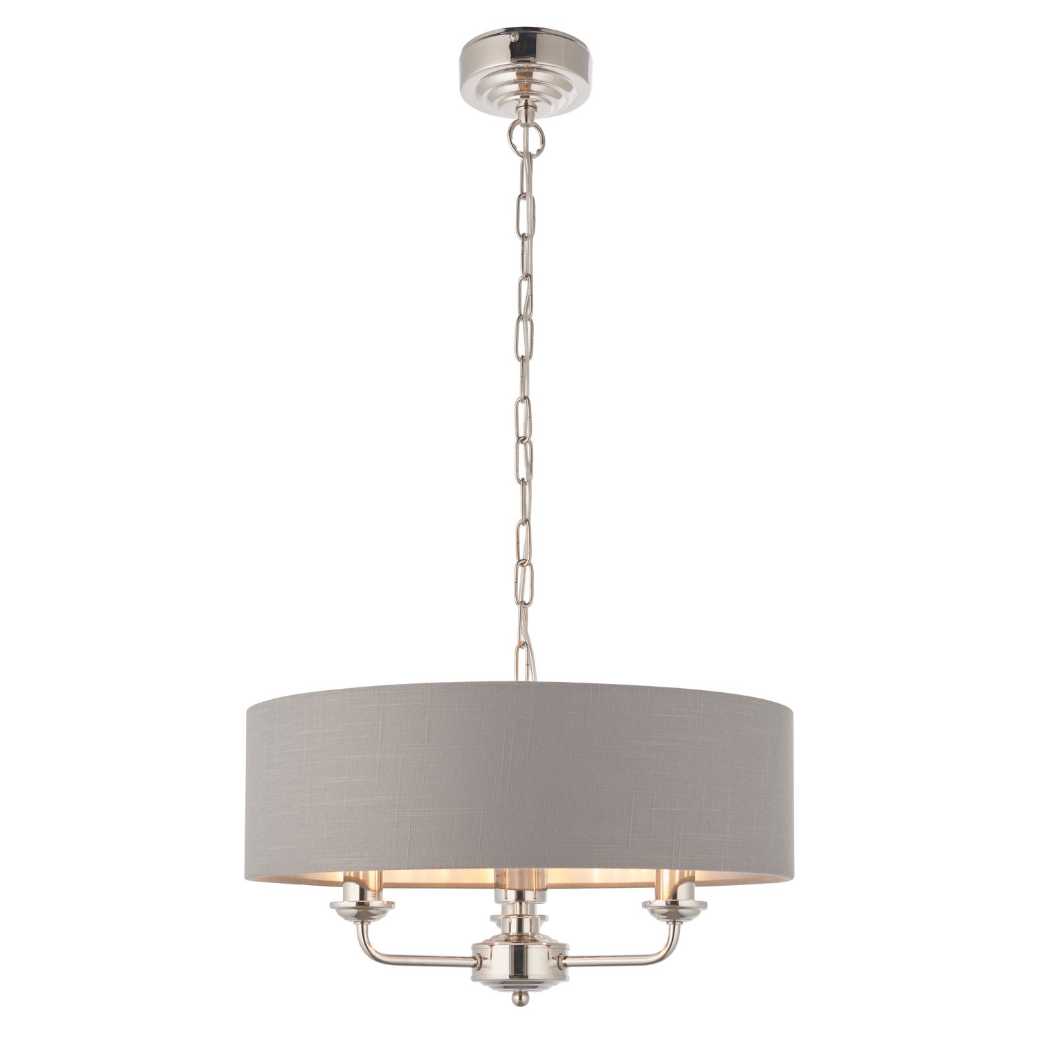 This 3 Light pendant is a sophisticated combination of charcoal linen mix fabric with reflective metallic inner and bright nickel plated metalwork. This statement light is the perfect timeless addition to modern and classic homes of today.