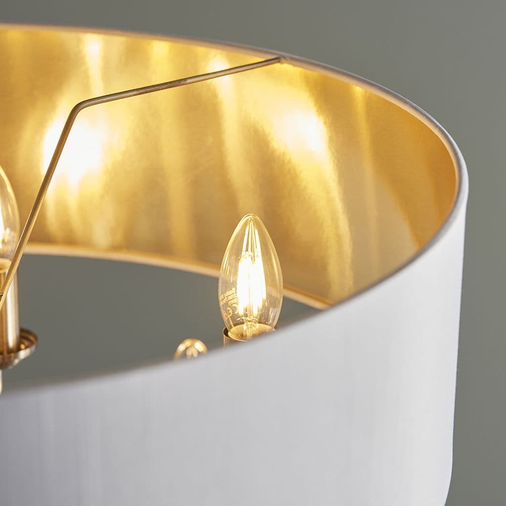 This 6 Light pendant is a sophisticated combination of white linen mix fabric with reflective metallic inner and antique brass plated metalwork. This statement light is the perfect timeless addition to modern and classic homes of today.