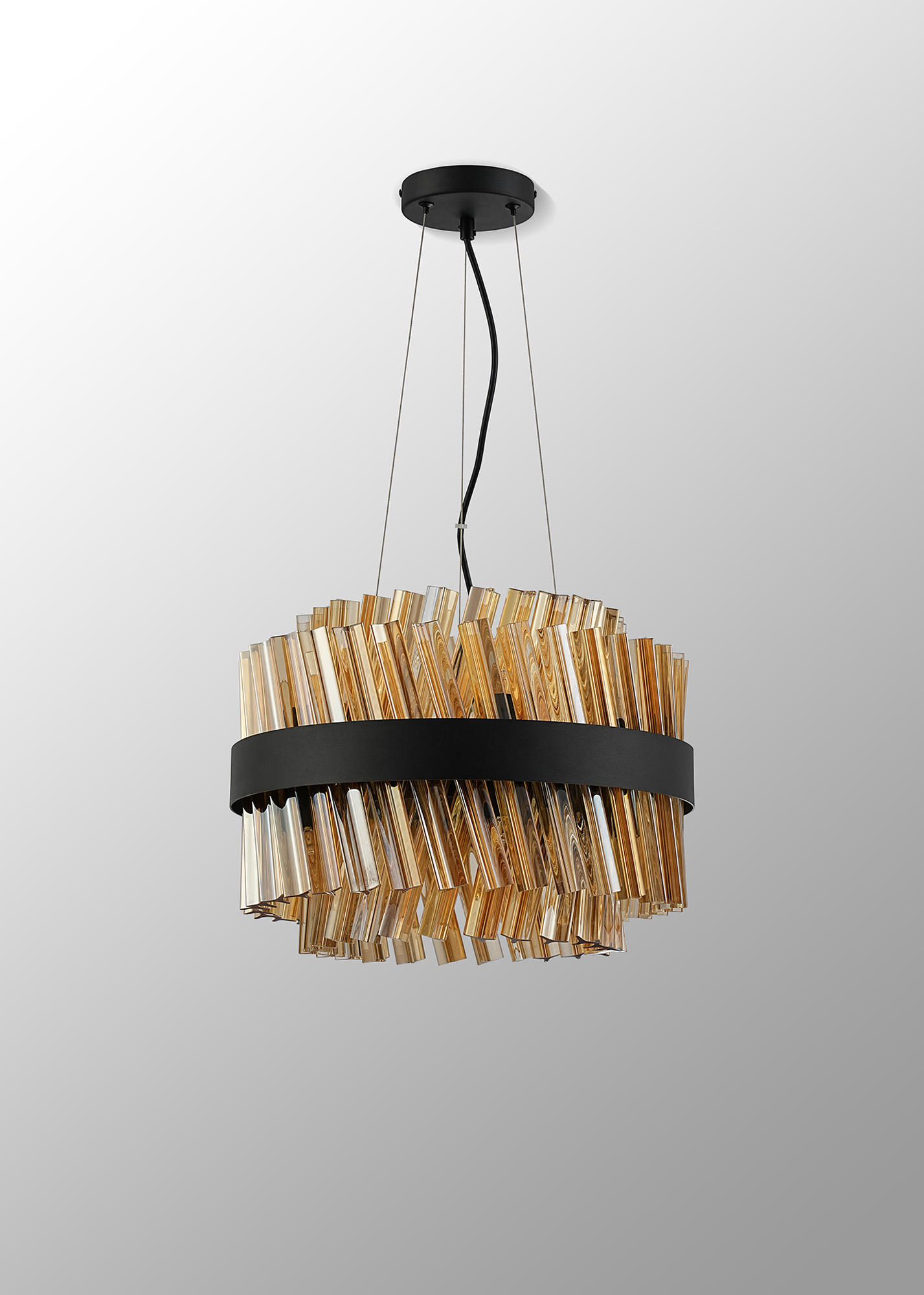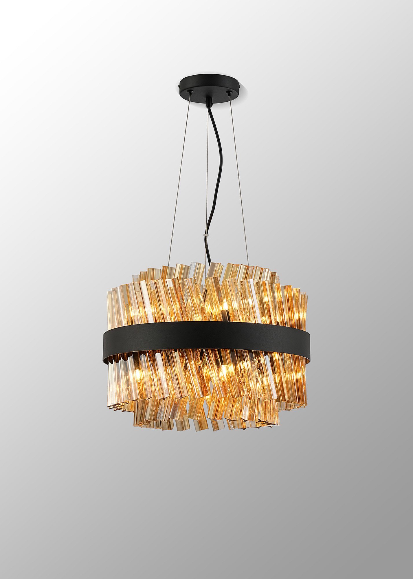 4002571 Cali 10 Light Pendant Satin Black with Amber Glass