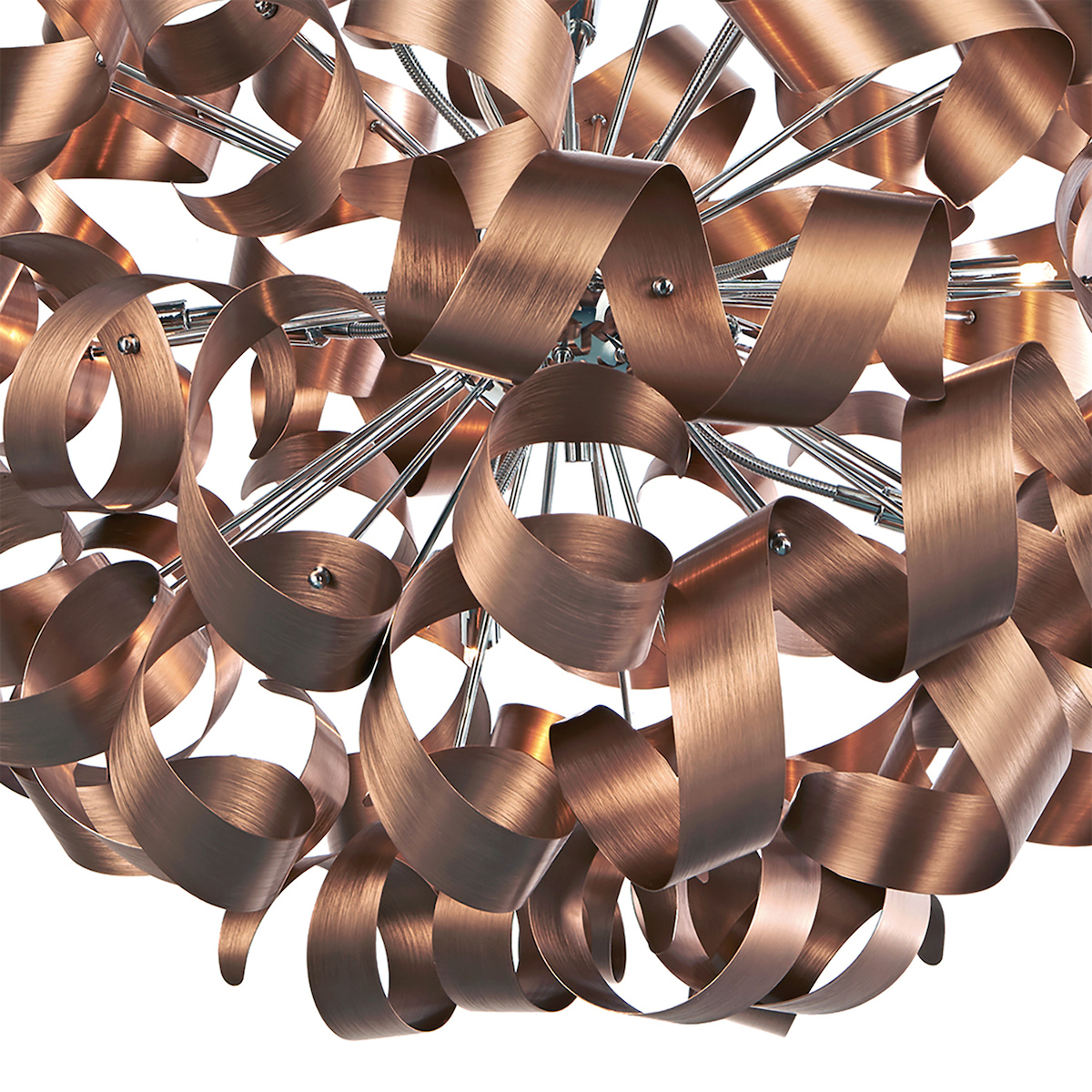 This modern ceiling pendant has polished base plate with Twisted metal finished Brushed Satin Copper.