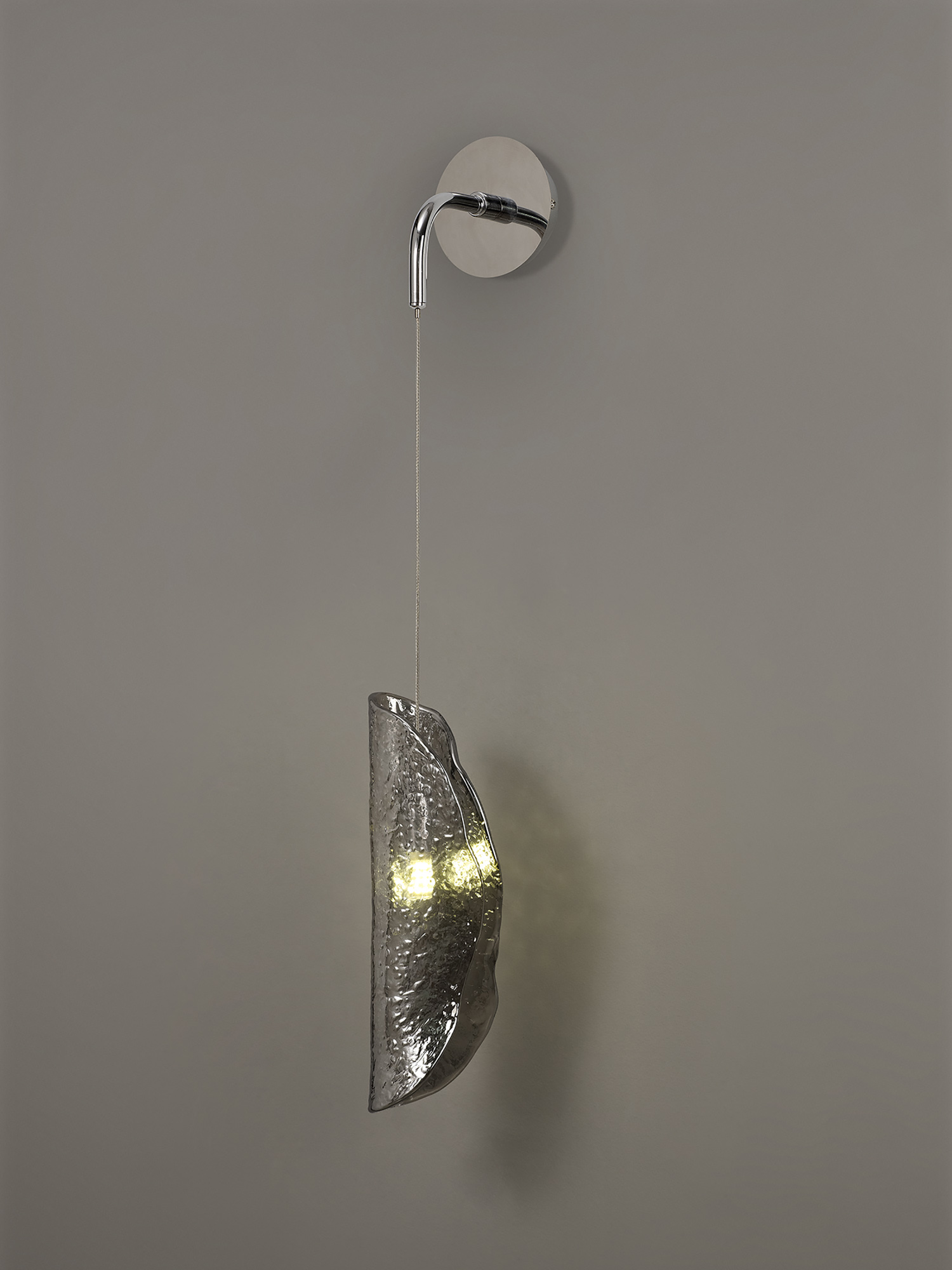 Scroll name is drawn from the wrapped glass pieces which diffuse the light emitted from the G9 lampholders, each suspended from an individual drop. With the picturesque smoked glass a serene ambience is provoked by the textured surface of the glass piece which shimmers beneath the coloured tint like light on water.