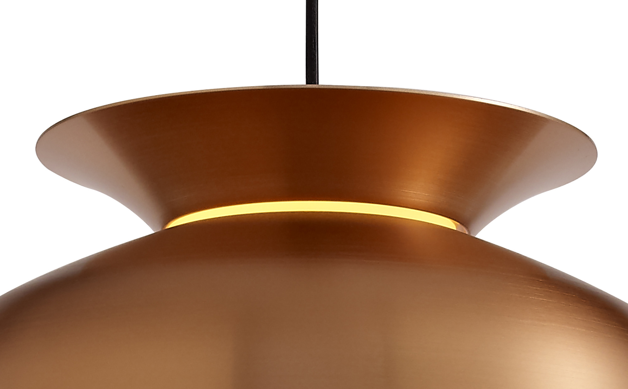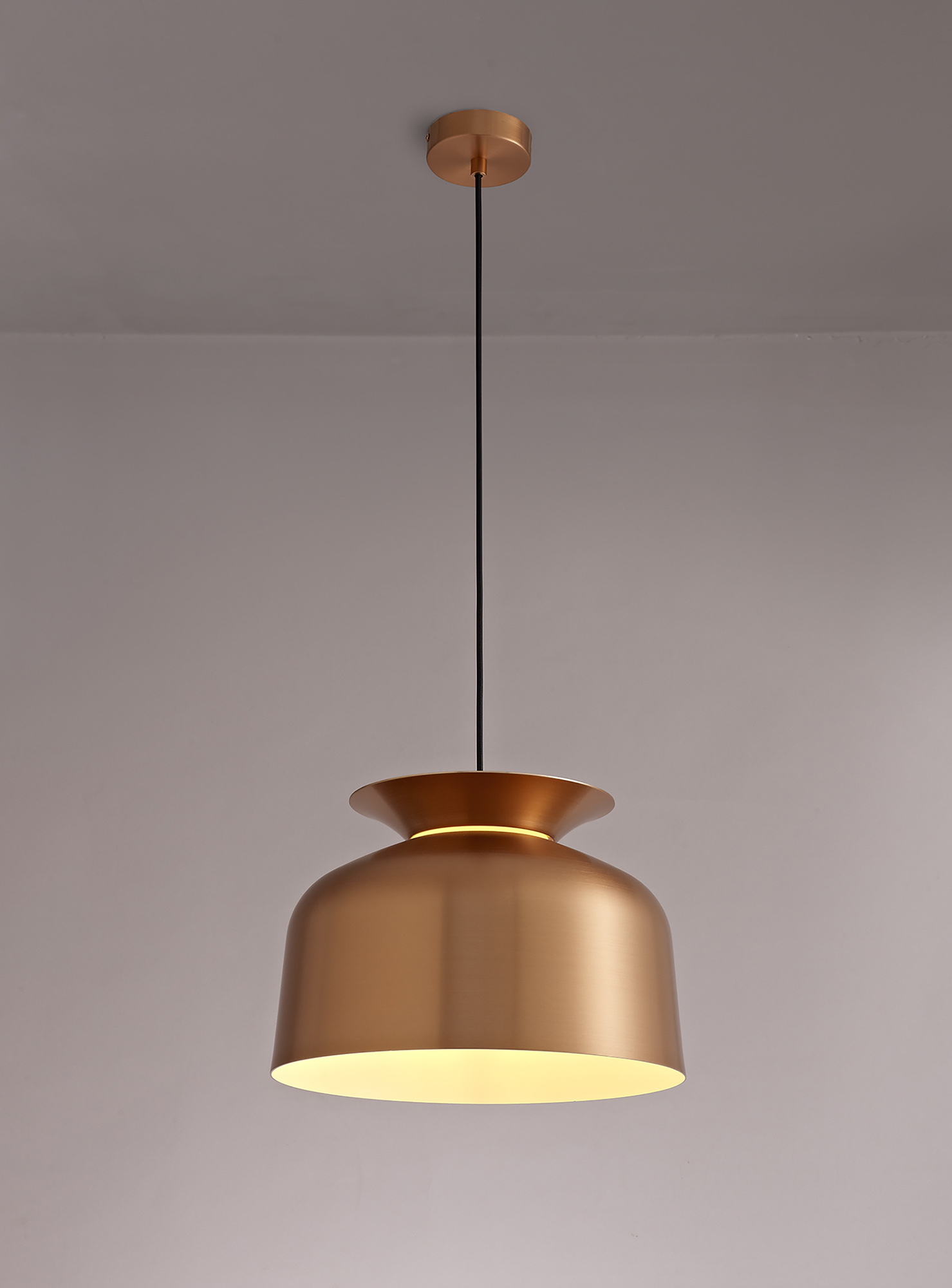 Teo is a collection of single pendants, the frames are formed from a larger dome shape and a shallow dish both positioned in different directions to outline the shape of a serving bowl. The slim diffuser where each piece meets has been added to give a soft halo of light in-between both shapes projected,