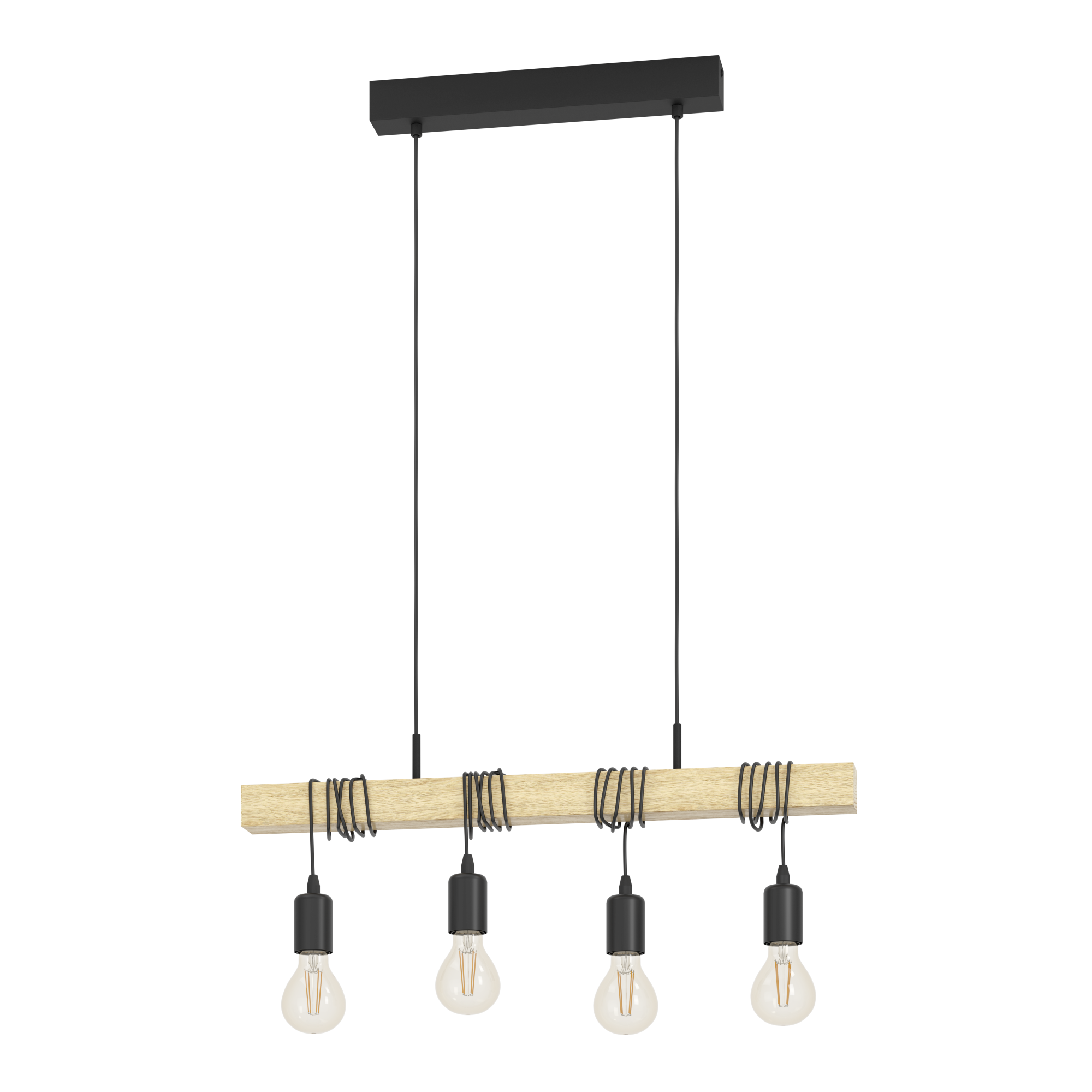 The TOWNSHEND pendant light features a wooden beam and four black lamp holders. The lamp holders are suspended at different heights and can be changed by winding or unwinding the cables. With its eye-contrasting mix of pine wood and metal, the pendant light blends seamlessly with trends such as vintage and industrial. The product provides modern lighting for any space, whether in the living room or over a long table in the dining room.