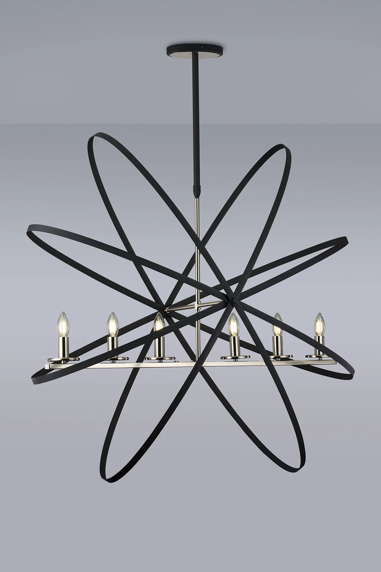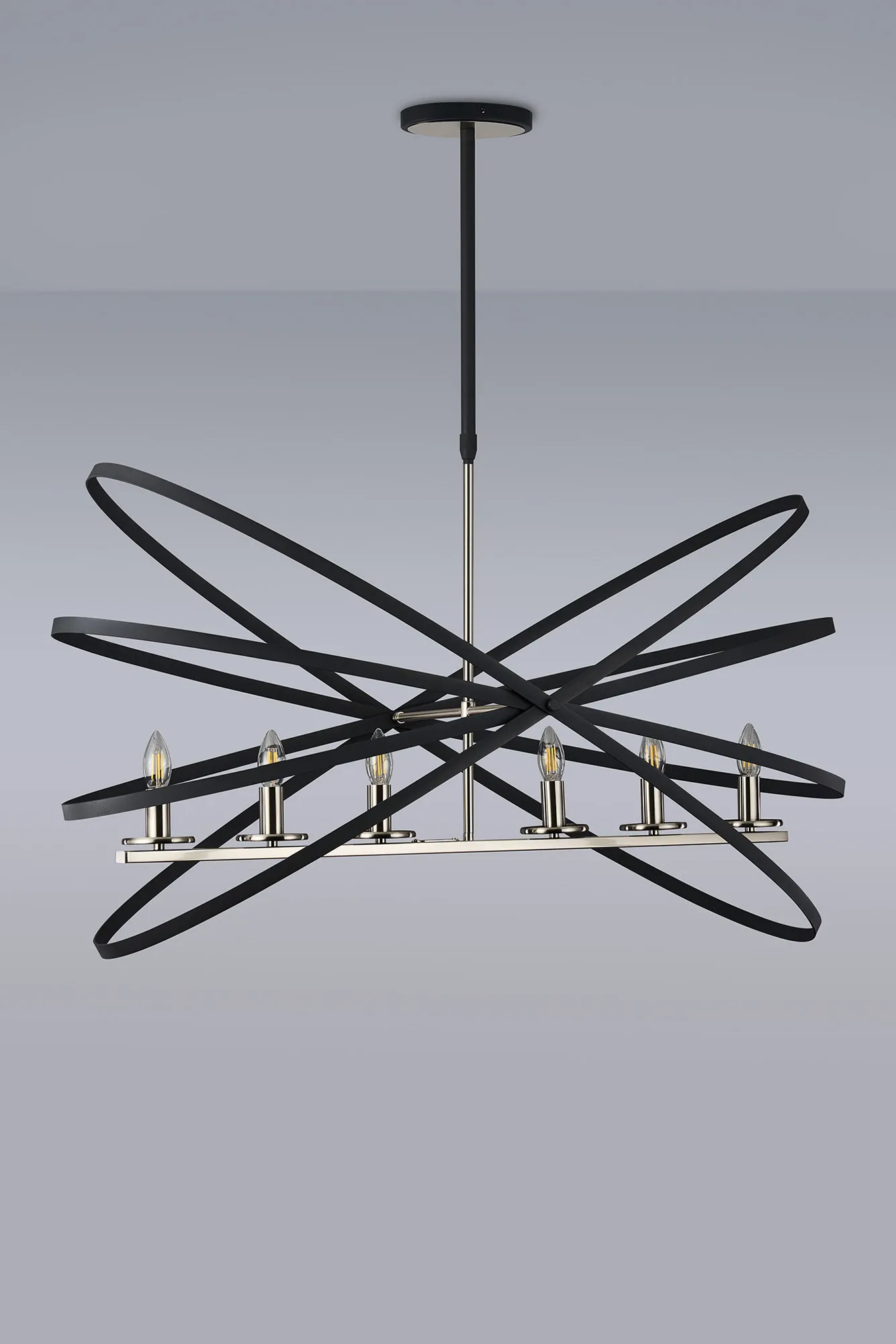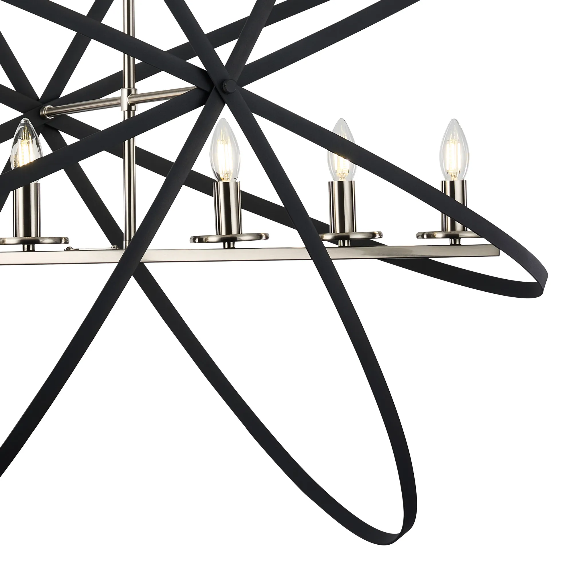 The combination of metallic framework combined with a darker decorative embellishment has proved excessively popular with some of our other ranges. In order to offer more style options within this concept we have now designed the Saturn range. Mimicking astrological rings, the darker metalwork erratically frames the E14 lamp holders of each fitting