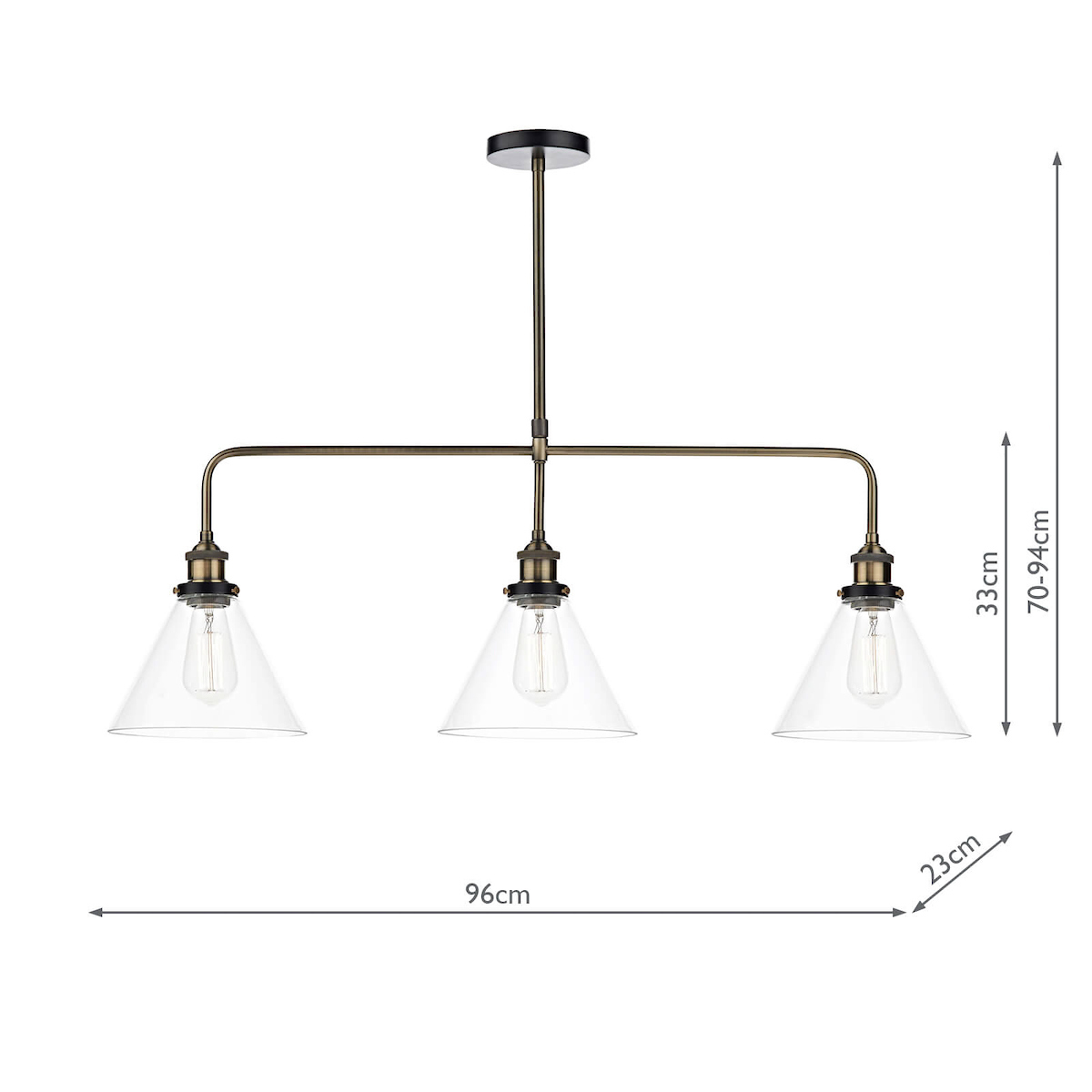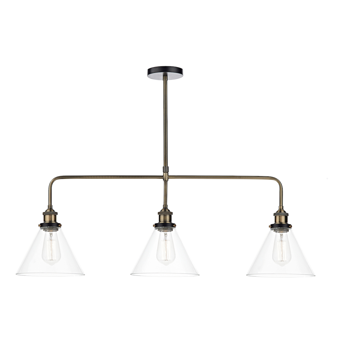 This triple pendant from DAR finished in Antique Brass with Clear glass shades.